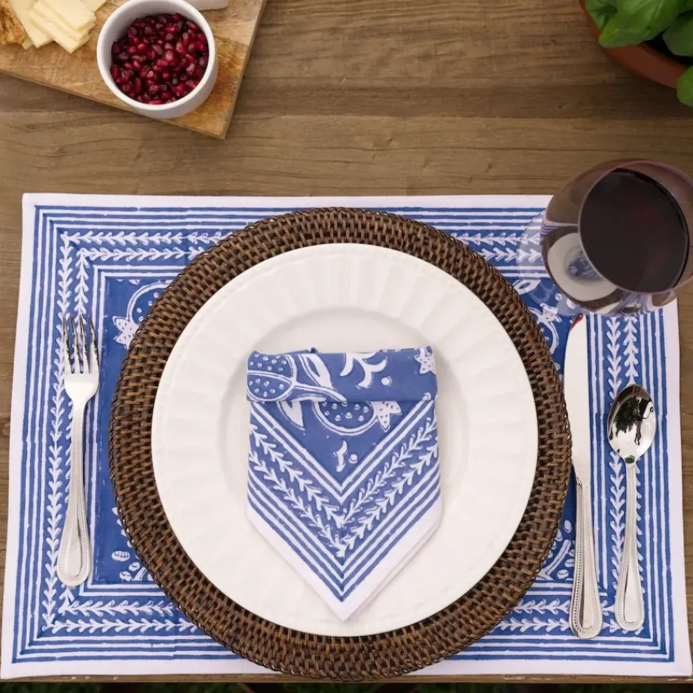 Pomegranate Blue is our brand’s signature print. Decorated in a distinctive, hand painted Pomegranate surrounded by lively fluerettes and a complimentary border, these placemats add a rich layer to your table setting.