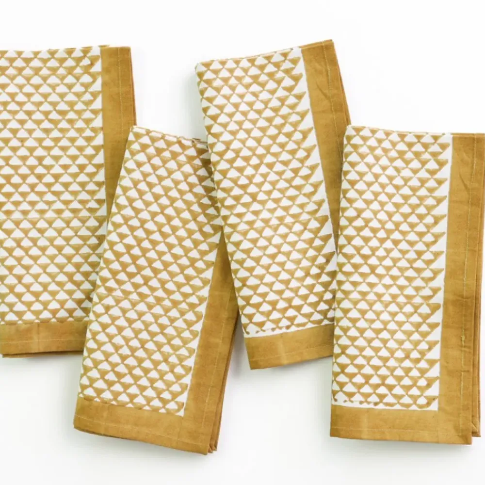 Bring a touch of modern elegance to your dining table with our Golden Triangle Napkins. This set of four napkins features a chic geometric design of yellow triangles arranged in a striking pattern, perfect for adding a contemporary flair to your table setting. Hand block printed on 100% cotton, these napkins are soft, durable, and machine washable, offering both style and practicality for daily use or special occasions. The minimalist design pairs beautifully with other prints, making them a versatile addition to any table decor