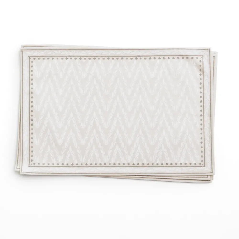 In the olden days, what we now see as the gold shoulder braid on high-ranking officers—called an aiguillette (pronounced “egg-wee-let”)—was originally just rope and pegs. It was carried on the shoulder by a knight’s aide-de-camp, ready to tether the knight’s horse. The ornamental braided cords with decorative metal tips are now worn on uniforms by officers to distinguish special and senior appointments, but wouldn’t it be fun if they were still used to tether the occasional horse? This hand block printed Chevron patterned placemat set draws its inspiration from those striking gold braids.