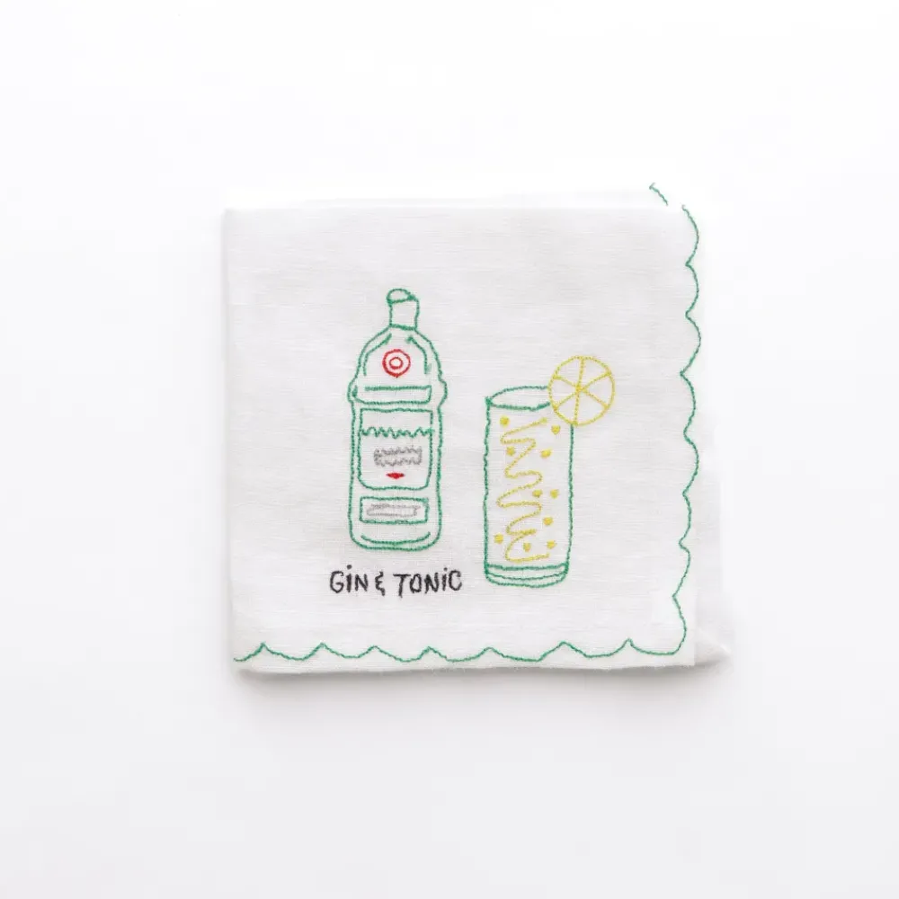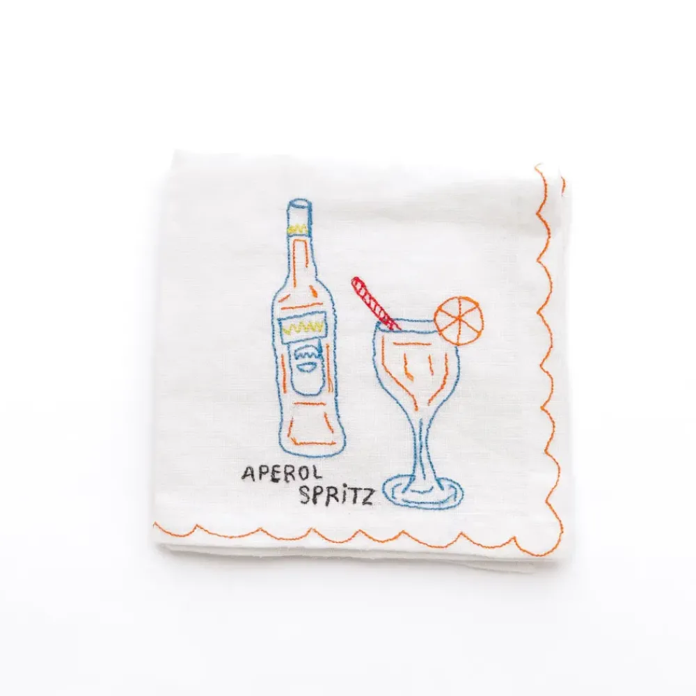 This set of six linen cocktail napkins features vibrant, hand-embroidered designs of classic cocktails: Old Fashioned, Gin & Tonic, Aperol Spritz, Margarita, Martini, and Mojito. Each napkin is accented with a colorful scalloped edge that coordinates with the drink’s embroidery, creating a playful yet elegant aesthetic. Perfect for hosting or gifting, these napkins bring a fun, whimsical vibe to any gathering while remaining practical for everyday use.