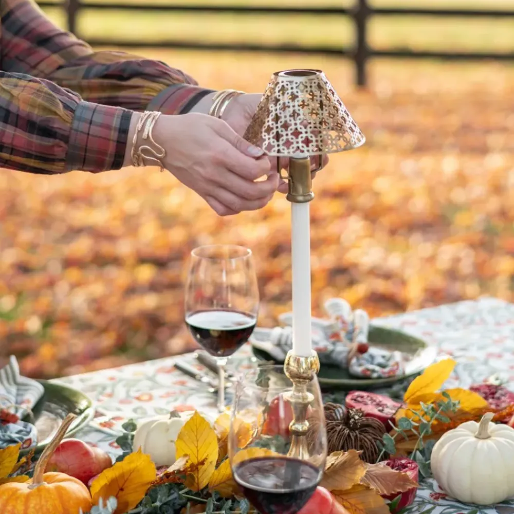 Our modern candlestick and cutwork shade comes in gold, silver, and bronze. This is a perfect addition for elevated, cozy gatherings around the table and home this fall and winter. Keep the candlestick shade or take it off, perfect for versatile entertaining.