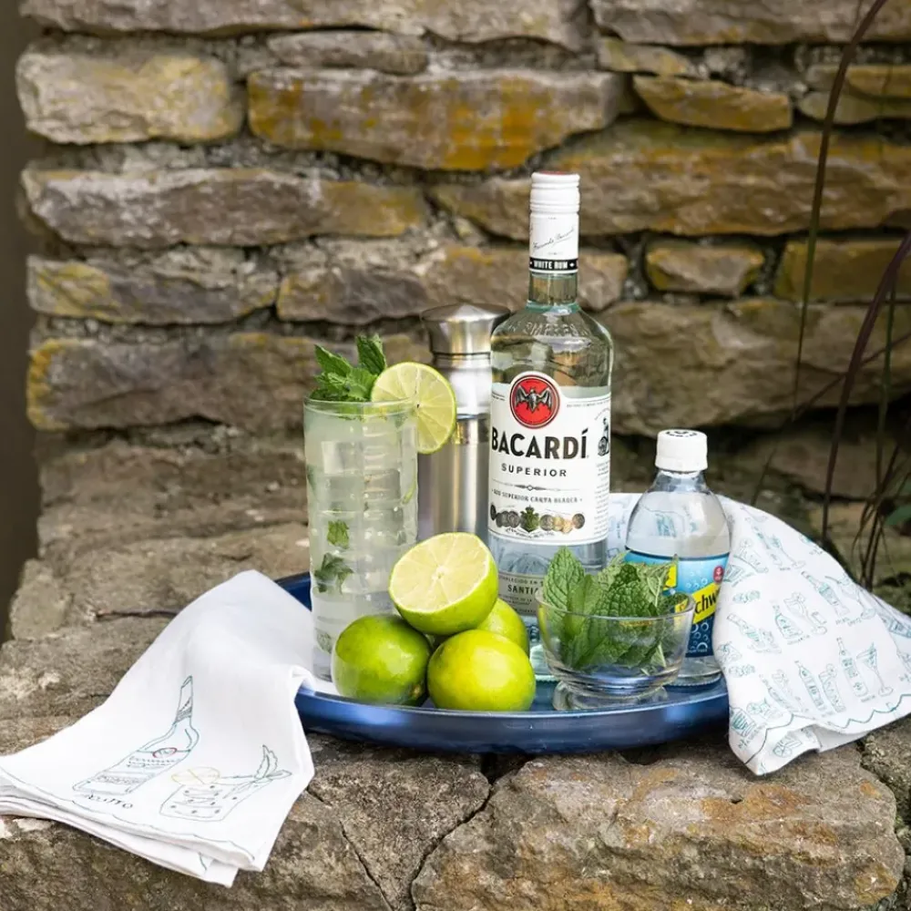 Sleek yet playful, our Mojito Tea Towels bring a touch of style to your kitchen or bar. This set features two elegant linen towels—one with an embroidered rum bottle and a glass decorated with citrus and mint, and the other printed with a variety of refreshing blue cocktail motifs. Refined scalloped edge detailing adds a finishing touch.