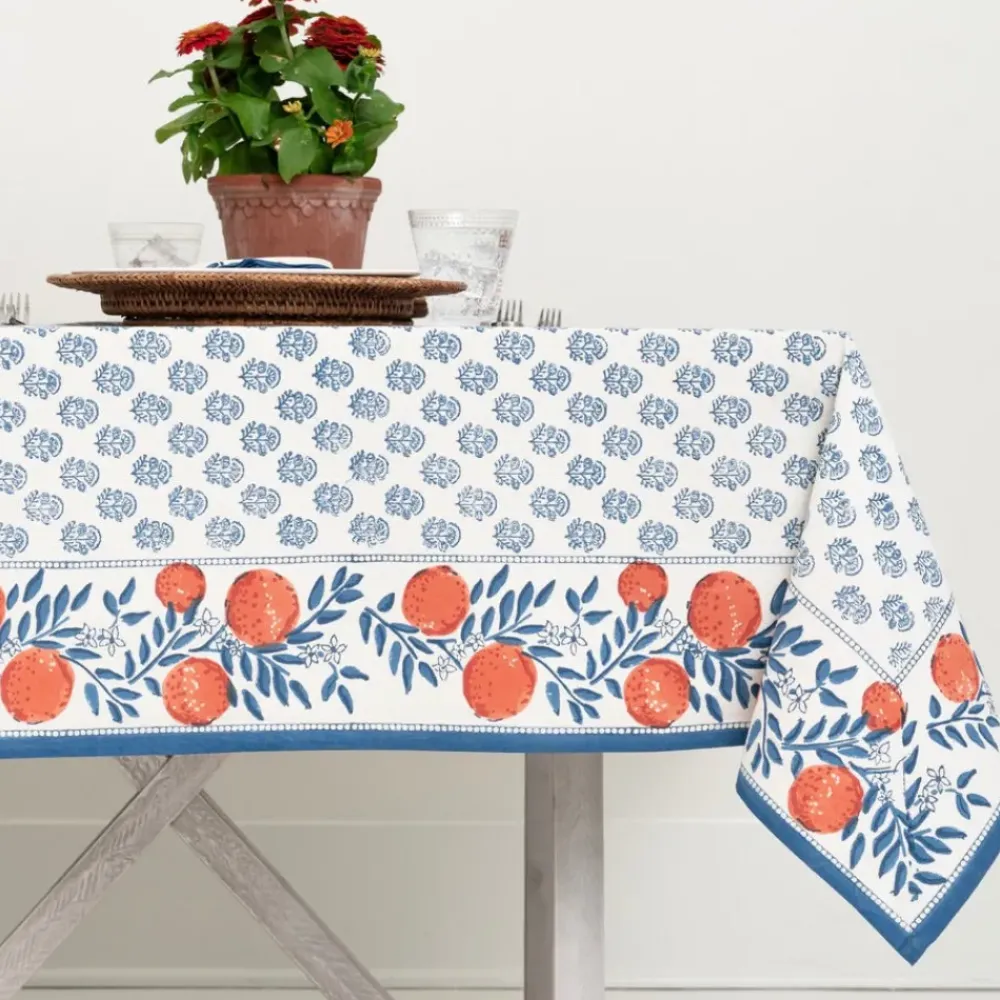 Gorgeously adorn your table with the Orange Grove Tablecloth. The beautiful blue and white floral pattern complements the hand painted oranges along the border, elevating your dining room with a touch of natural beauty. Perfect for any occasion!