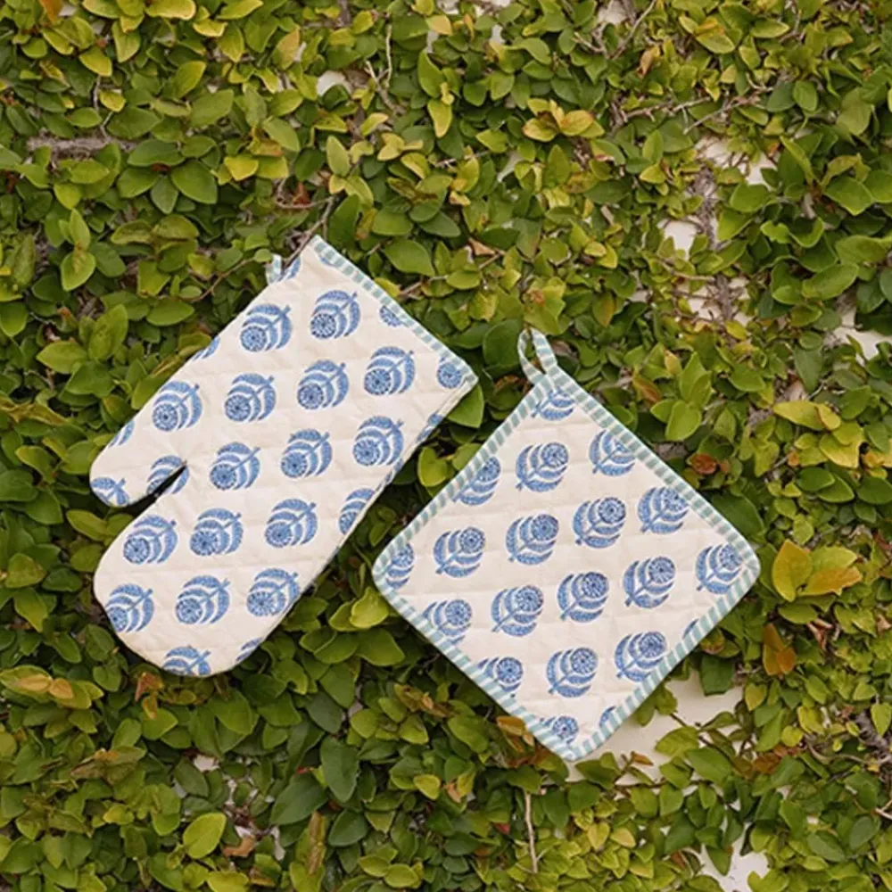 Our latest exclusive periwinkle blue and white print is refreshing yet cool, traditional and exotic, all at the same time. Cheer up your kitchen with this unique blue and white oven mitt set.