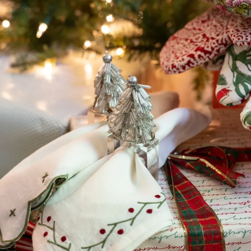 Celebrate the holiday season with a touch of sparkle using this Set of 4 Silver Christmas Tree Beaded Napkin Rings. Each ring features a beautifully beaded silver Christmas tree, bringing a festive and elegant accent to your holiday gatherings and wintertime meals.