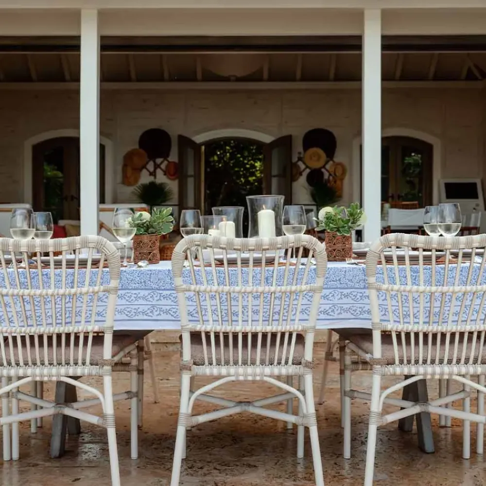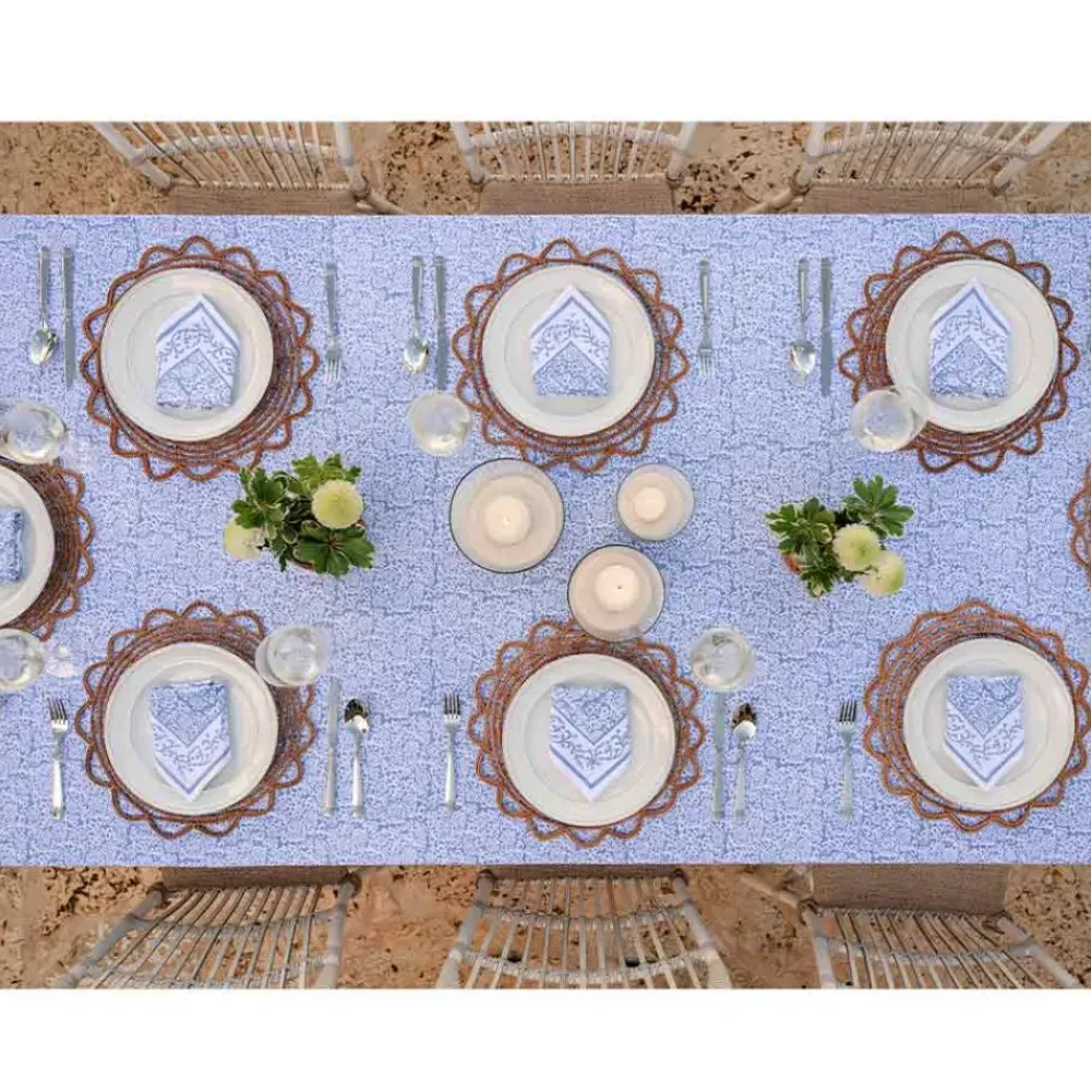 This updated traditional classic blue and white hand block printed, Tapestry Blue Tablecloth was designed to symbolize the weaving of stories that are shared during meals. Explore conversations with family, friends, and guests that remind us of the beauty of details and encapsulates the tapestry of your entertaining.