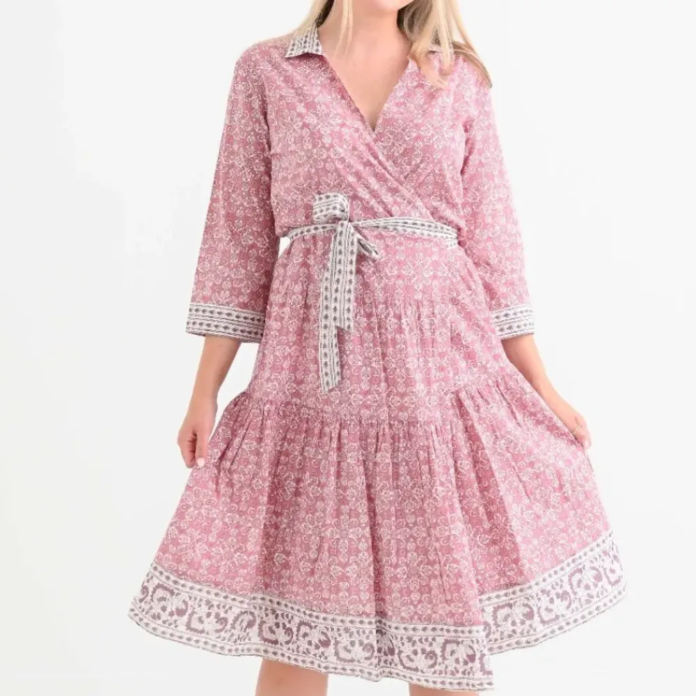 This Tulip Sundial Mauveglow Collared Wrap Dress highlights refinement and sophistication. The flattering wrap dress is tailored for a classic silhouette, and the soft mauve pink geometric print is complemented by a coordinating belt and border. Complete with an open collar, this dress is perfect for an afternoon in town or a romantic evening stroll.