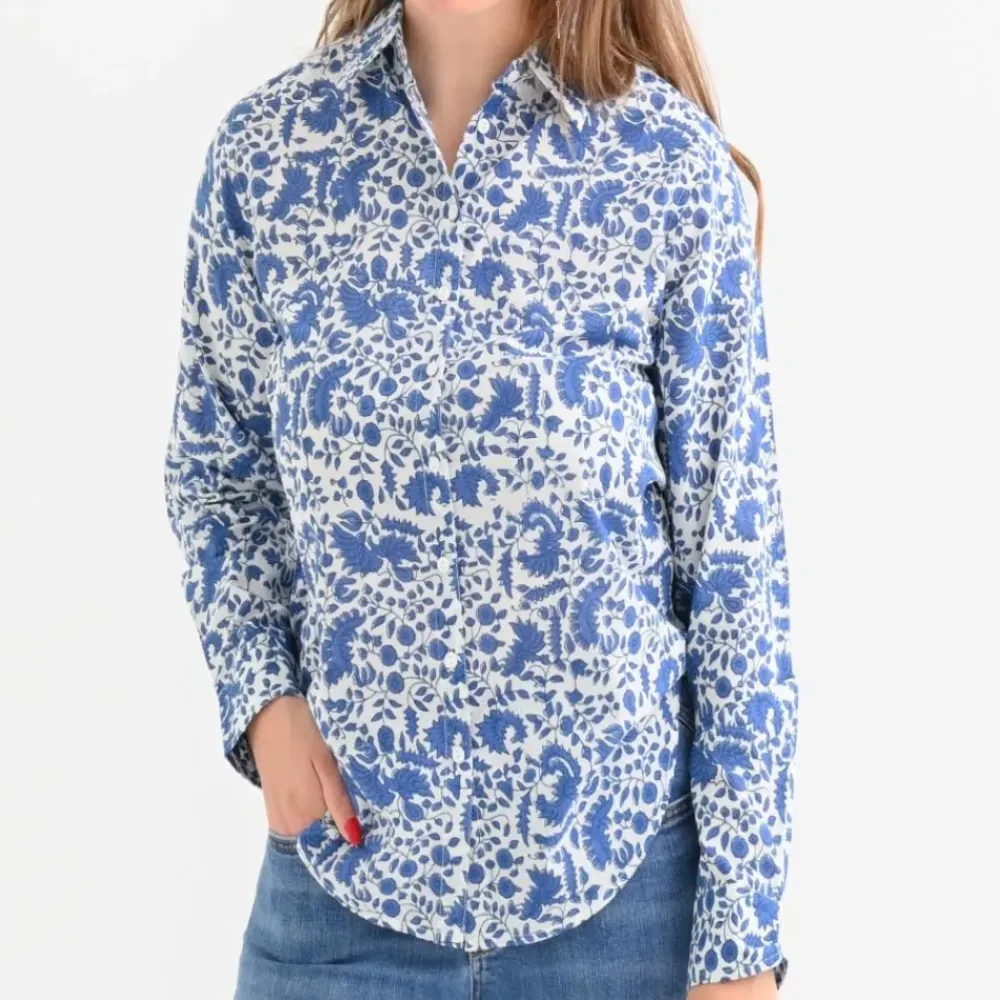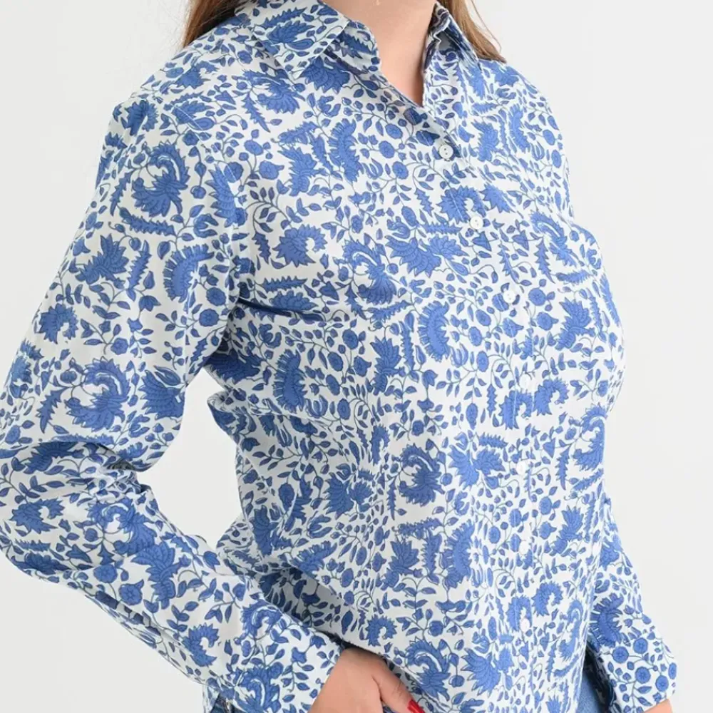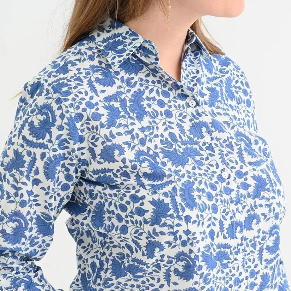 Cobalt blue flowers dance across our classic and versatile button down. Easy to dress up with a pair of white jeans and stiletto sandal, or perfect for casual everyday, with a pair of flats or flip-flops. Tidy up by tucking it in, or stay chilled by leaving it out; Pomegranate 100% cotton apparel is soft to the touch and so easy to wear.