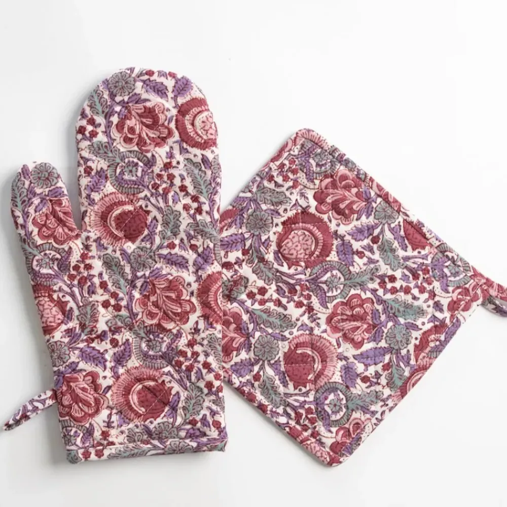 Bring a touch of artistic flair to your kitchen with the Bohemian Floral Dusty Rose Oven Mitt Set. Each mitt is hand block printed with a bold and intricate floral design, showcasing shades of dusty rose & lilac. Made from 100% cotton, these mitts offer excellent heat resistance and a comfortable grip, ensuring your hands stay protected while you cook.