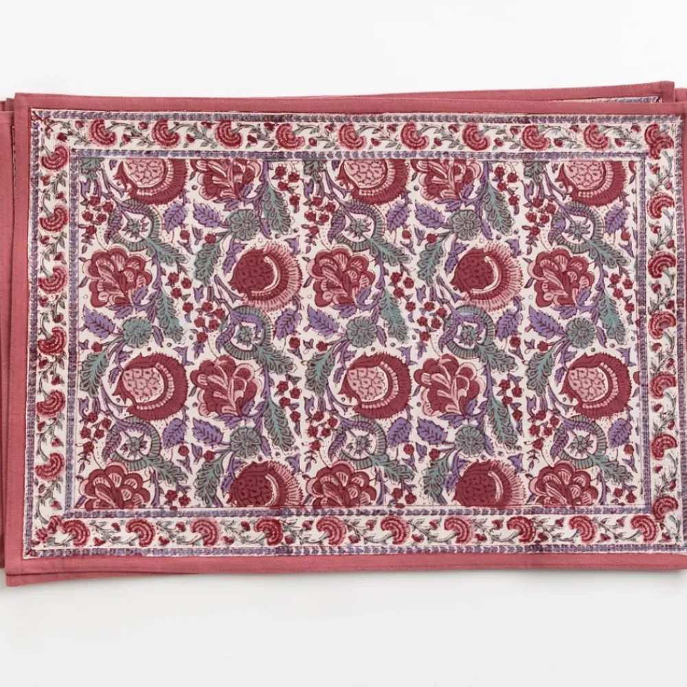 Transform your dining table with the Bohemian Floral Dusty Rose Placemats. Hand block printed with a floral design, these placemats feature rich hues of dusty rose & lilac adding a sophisticated touch to any meal. Sold in a set of four, these 100% cotton placemats are also practical, providing a durable and easy-to-clean surface for everyday use or special gatherings.