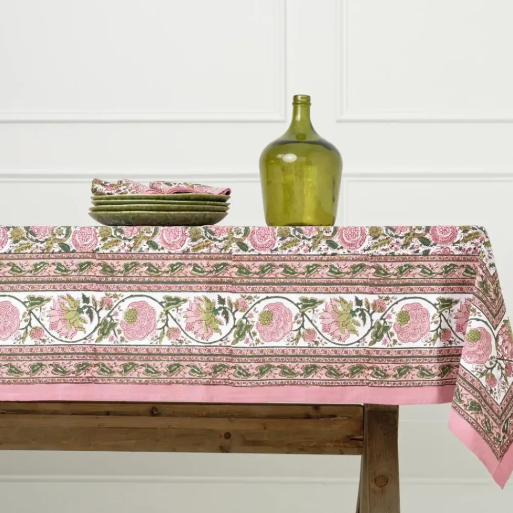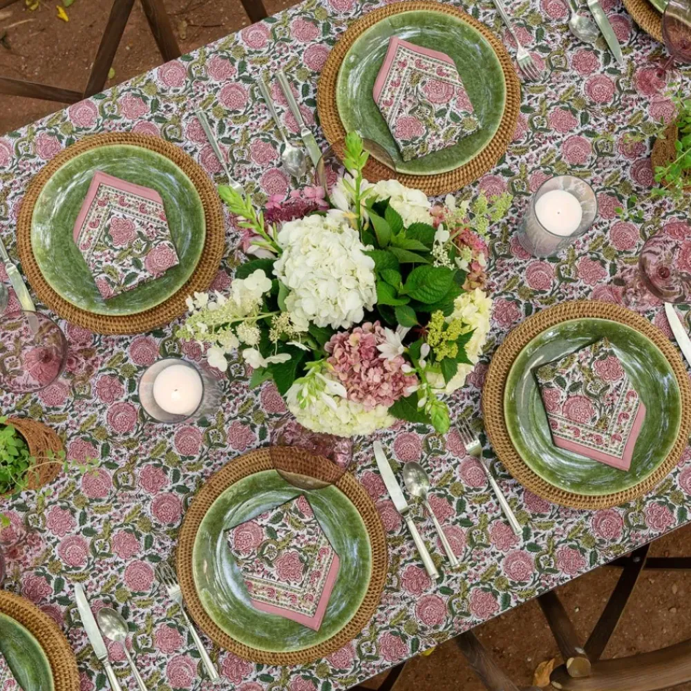 Our Bohemian Floral Moss & Mauve Tablecloth, as seen on CBS Sunday Morning, is not merely a decorative piece; it’s a statement of your refined taste and appreciation for the beauty of the seasons with it’s warm and inviting hues of mossy greens and mauvy pinks.