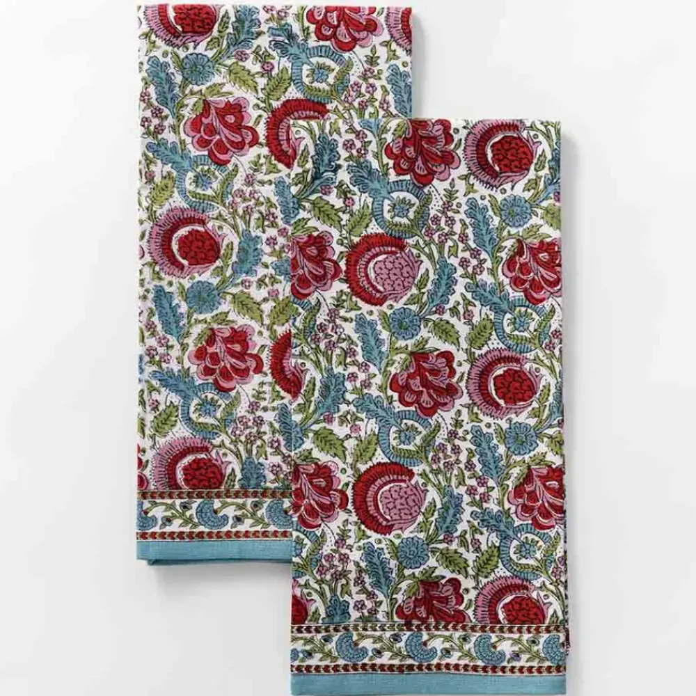 Cool and chic, our bohemian floral print in turquoise and cherry hues is refreshing and unique, traditional and exotic, all at the same time. Elevate your kitchen with the our latest recolor of one of our favorite prints in turquoise, cherry red, pink and aqua cotton hand block printed tea towels, and pair with matching apron and oven mitt sets. A lovely updated kitchen textile to add a pop of color to your everyday. A great gift for your cooking enthusiast!