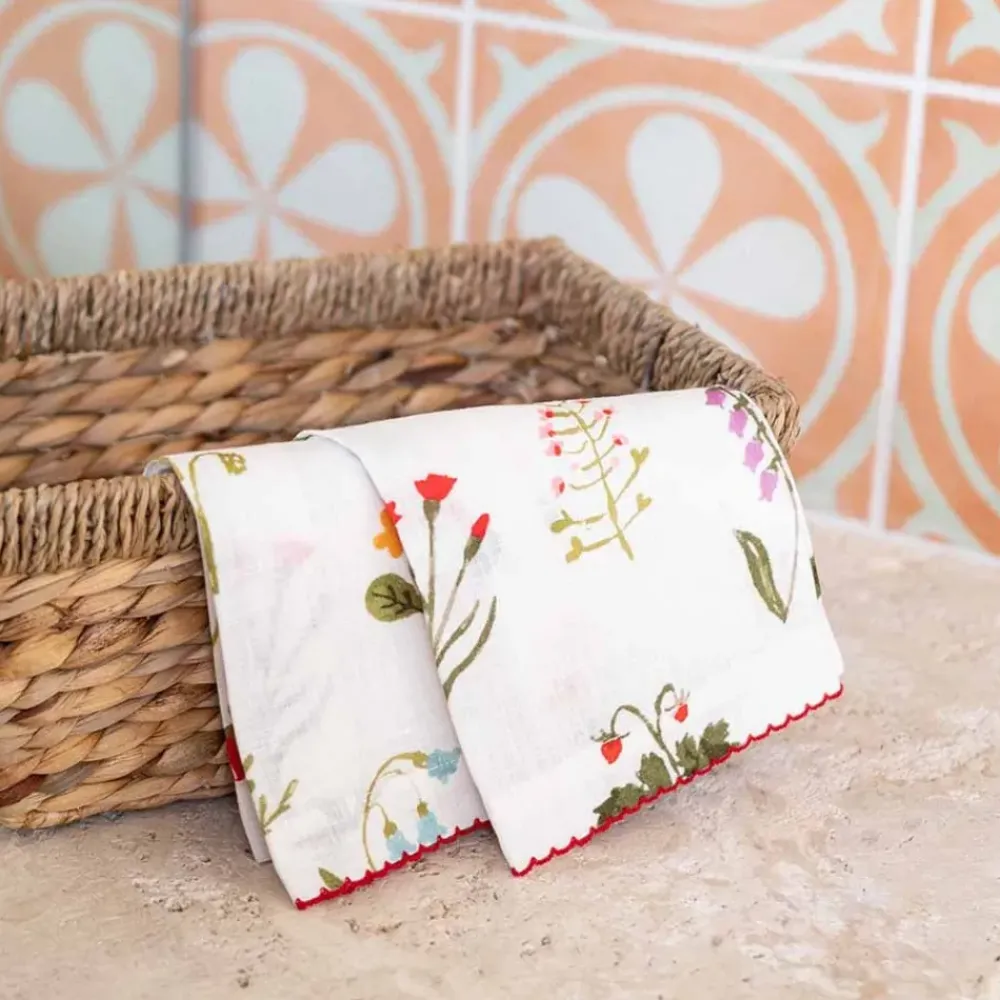 As fresh as an organic cutting garden, our Botanical Garden print is crisp and distinctive, with fresh red poppy flowers, miniature yellow daffodils and lavender bluebells floating on a soft white linen base. Edged with a red scalloped stitch, this exclusive printed design is seasonless; perfect for everyday and elevated entertaining.