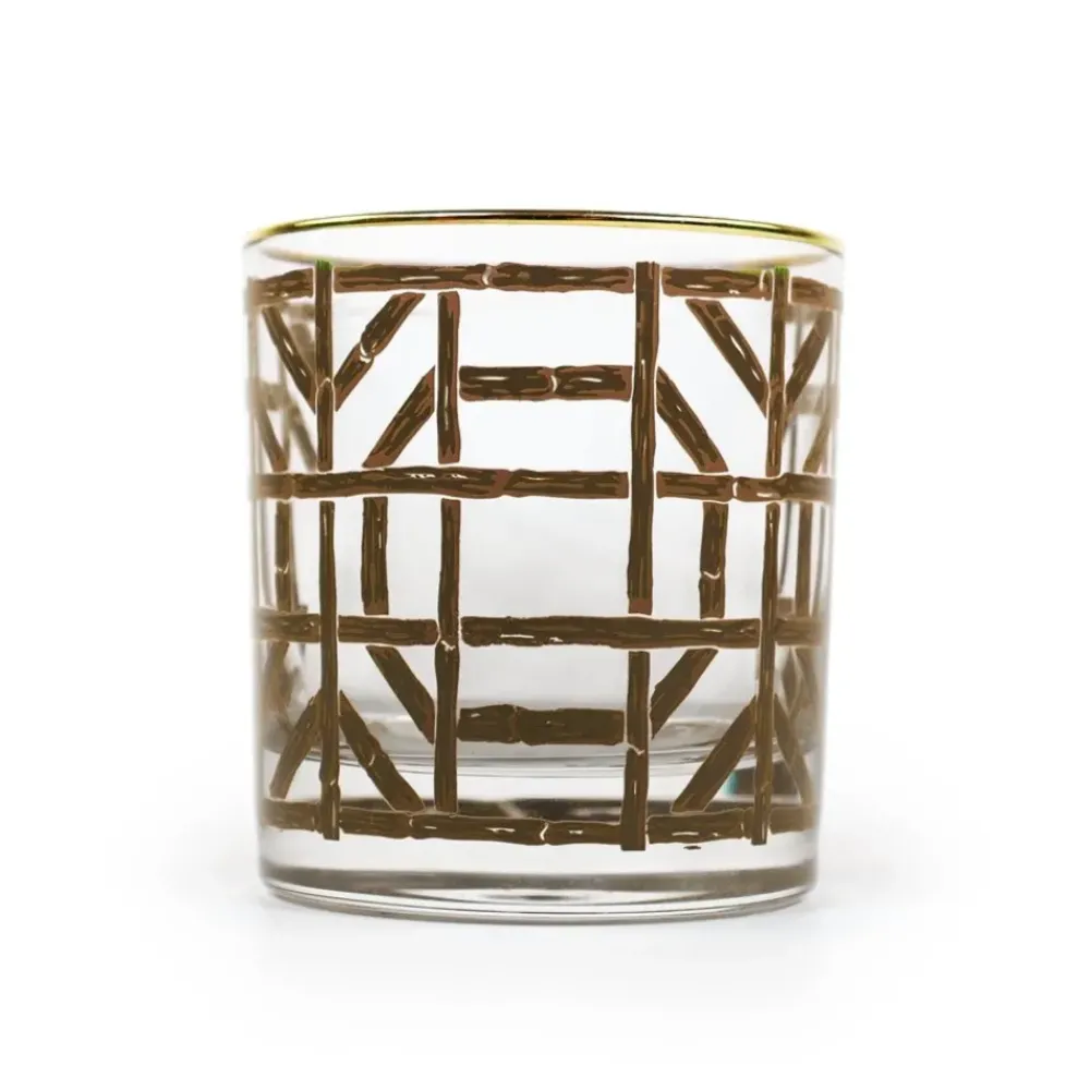 Graphic, yet sophisticated, our Brown Bamboo Bourbon Glass features a hand-applied decal wrap of a geometric bamboo pattern and a gold metallic rim that dresses it up for a special occasion while still practical enough for everyday use too.