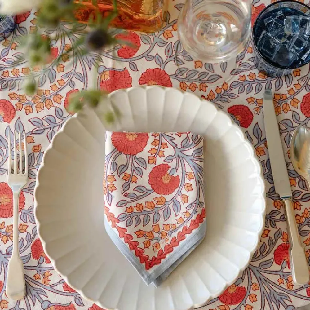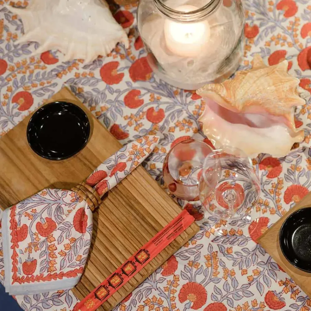 Introducing a beautiful new print that is predicted to be a best seller year round! This floral print showcases periwinkle vines and warm orange blooms with earthy undertones. Perfect for day or night and all seasons, it is sure to bring a colorful but calming energy to your dining experience.