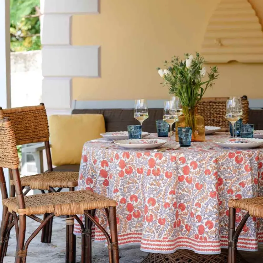 Introducing a beautiful new print that is predicted to be a best seller year round! This floral print showcases periwinkle vines with warm orange blooms and earthy undertones. Perfect for day or night and all seasons, it is sure to bring a colorful but calming energy to your dining experience.