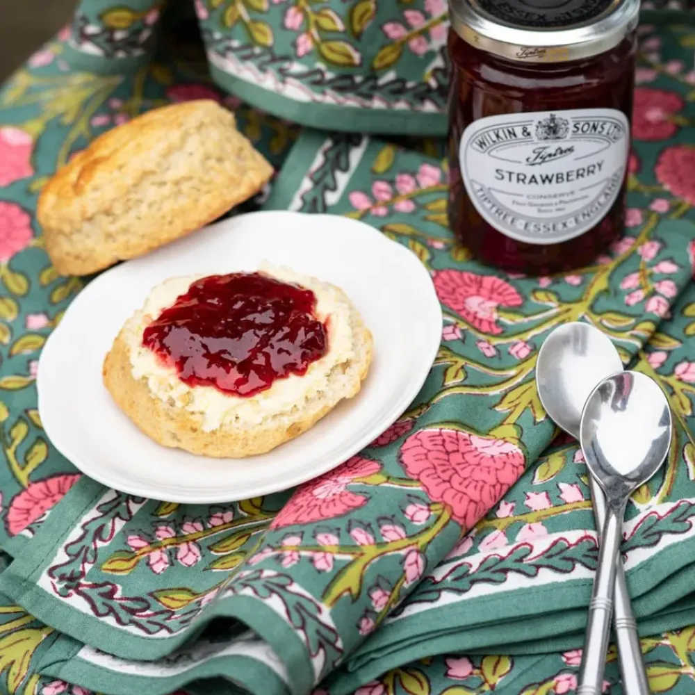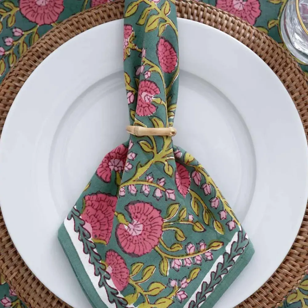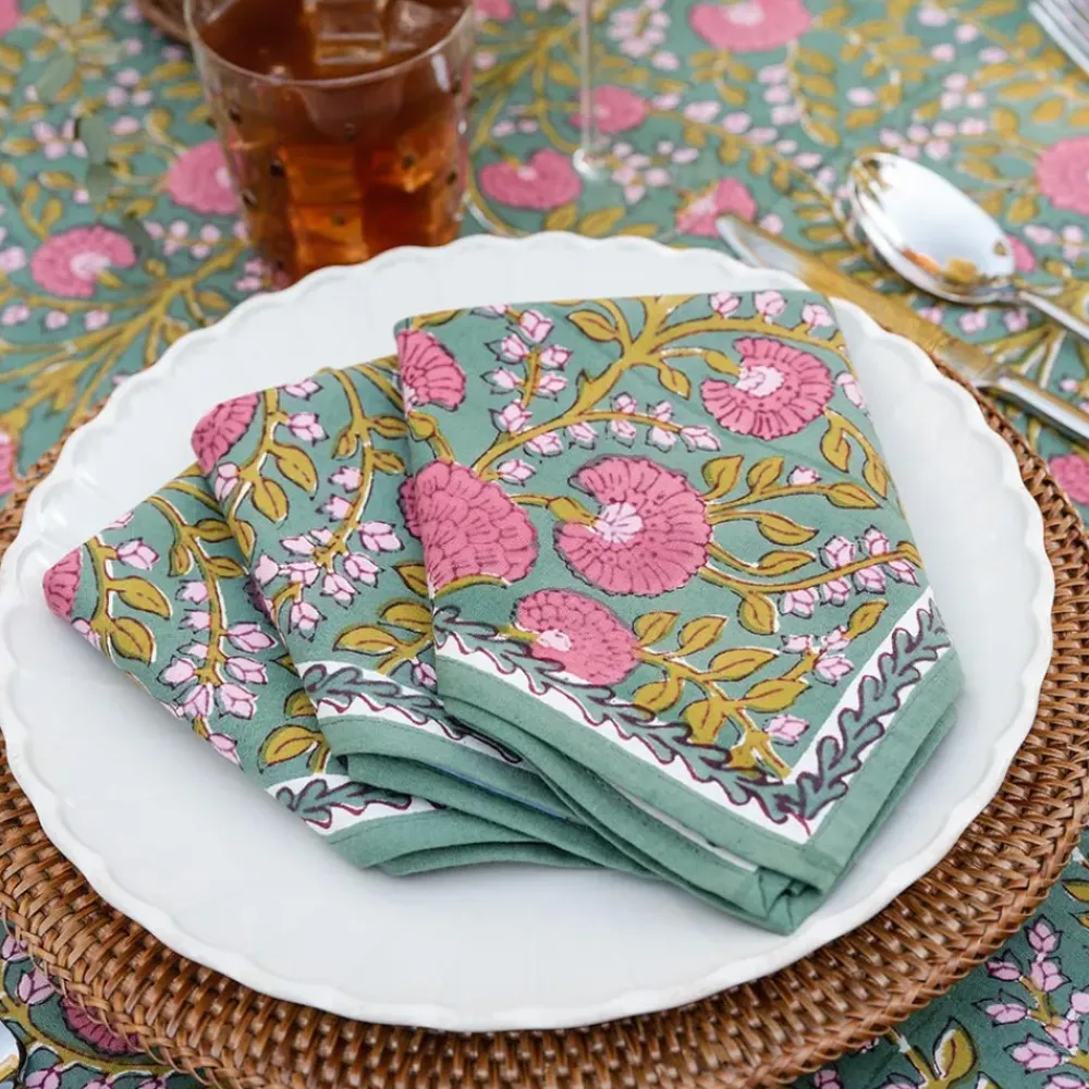 Cool and earthy, this lush botanical green print highlighted with pink blossoms and citrine leaves is perfect for day to night. Sit around your table with boho chic rich hues. These fabulous napkins will recharge and update your table. Coordinating tablecloths, table runners and placemats complete the set.