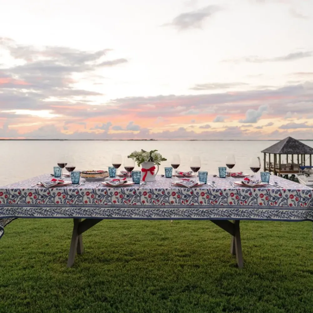 Our vintage Emma print has been going strong for over 25 years. This updated red, white and blue version is patriotic and all-American. Think Memorial Day and 4th of July, summer picnics and clam bakes. Pomegranate tablecloths are available in assorted sizes for all of your family gatherings, celebrations, around tables large and small, square, oblong and round.