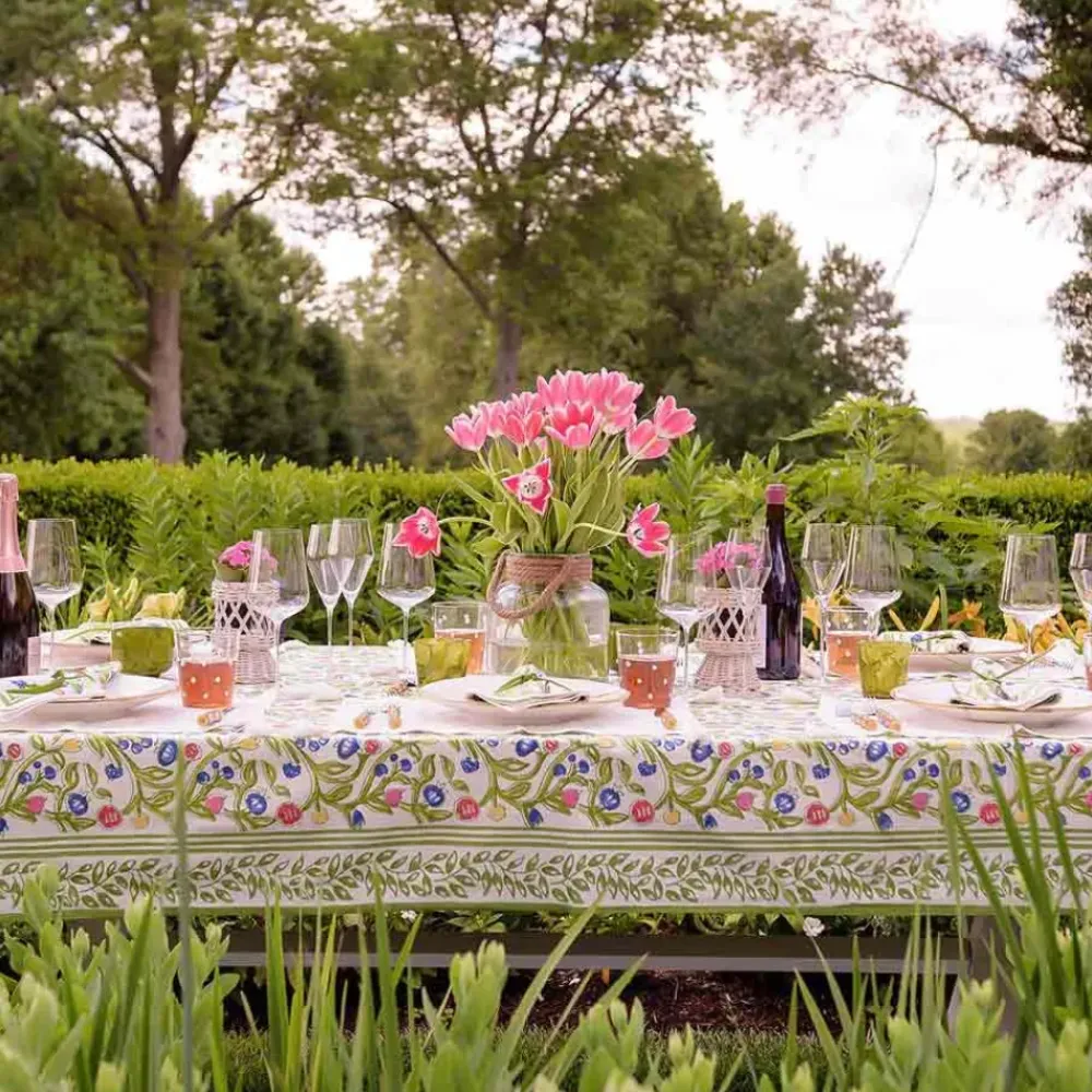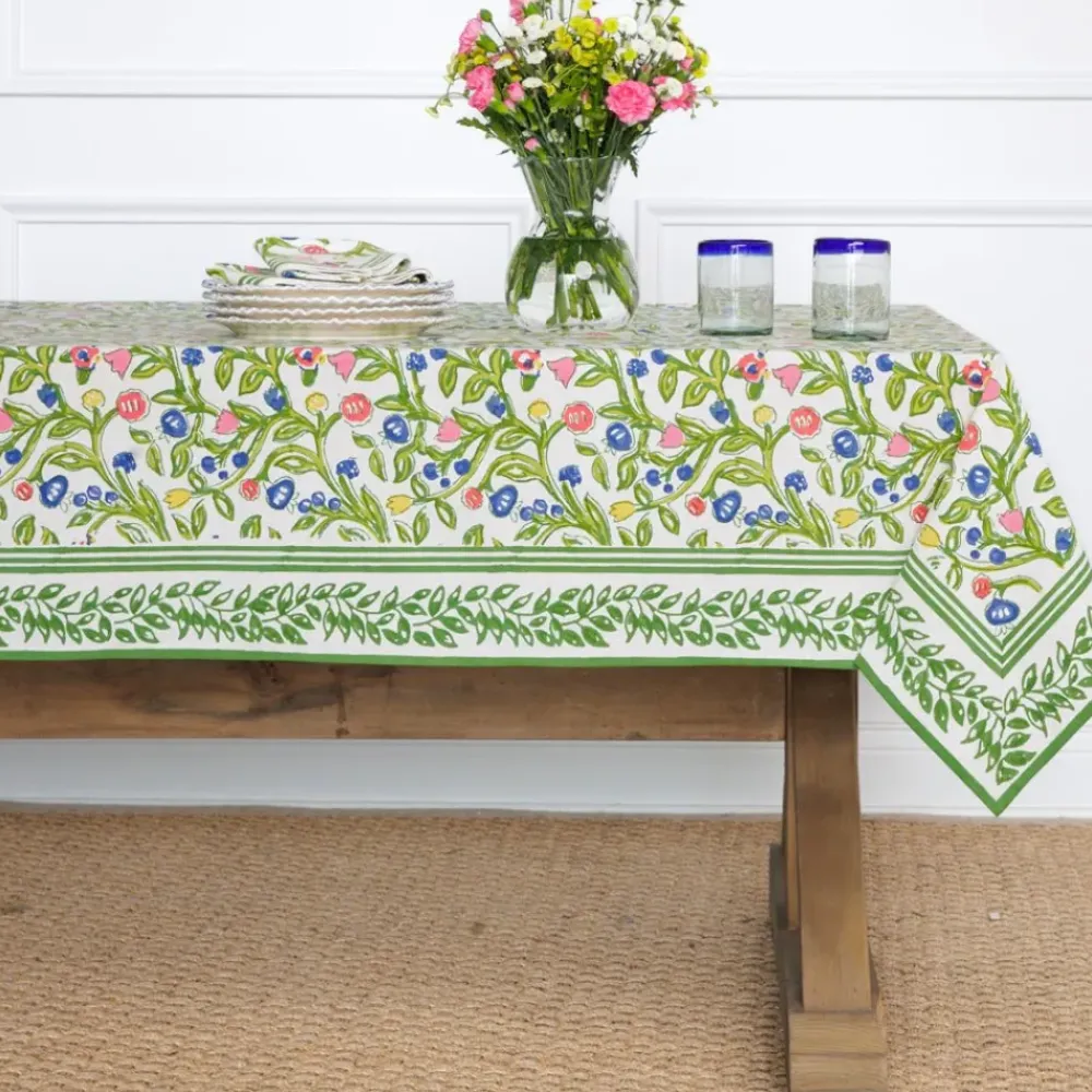 The essential Spring pattern! Hand painted flowers stretch across the vine in vibrant shades of yellow, blue, and red. Our Emma Tablecloth, a unique hand-blocked style that will give your dining table a fresh new look.