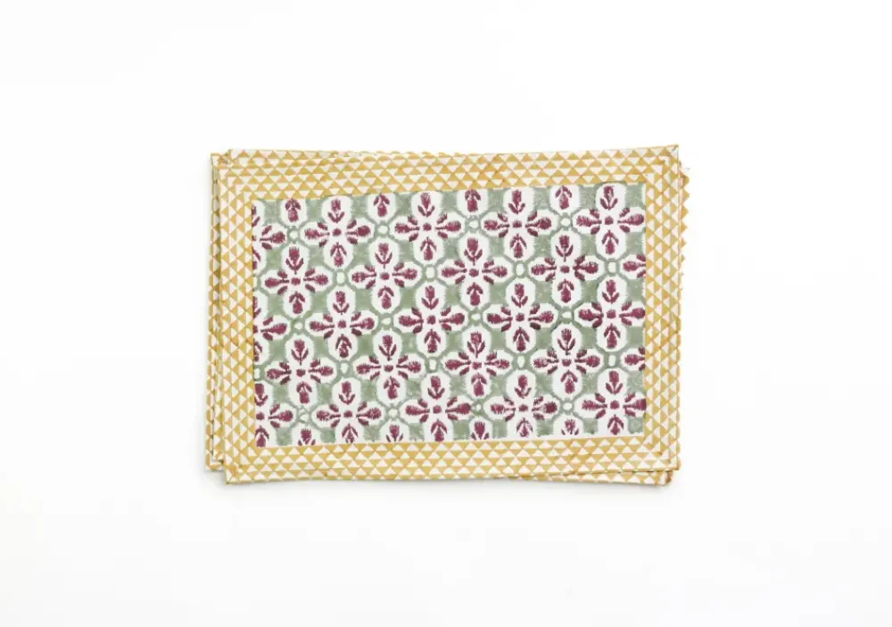 Featuring a classic Fleur de Lis design in jade green hues, bordered by a soft mustard geometric pattern, these placemats make a stunning statement. Handcrafted from 100% cotton and block printed for an artisanal touch, they bring both beauty and practicality to your table. Perfect for pairing with matching napkins for a cohesive look.