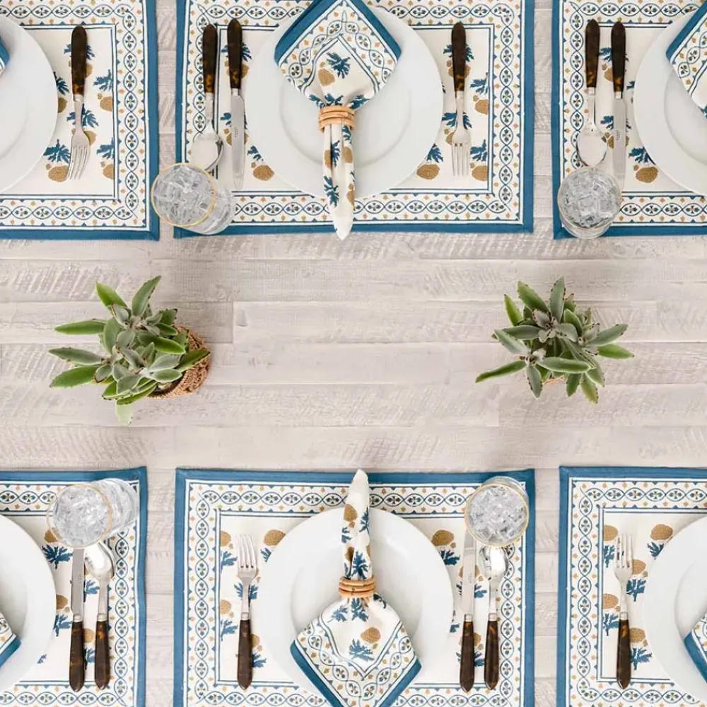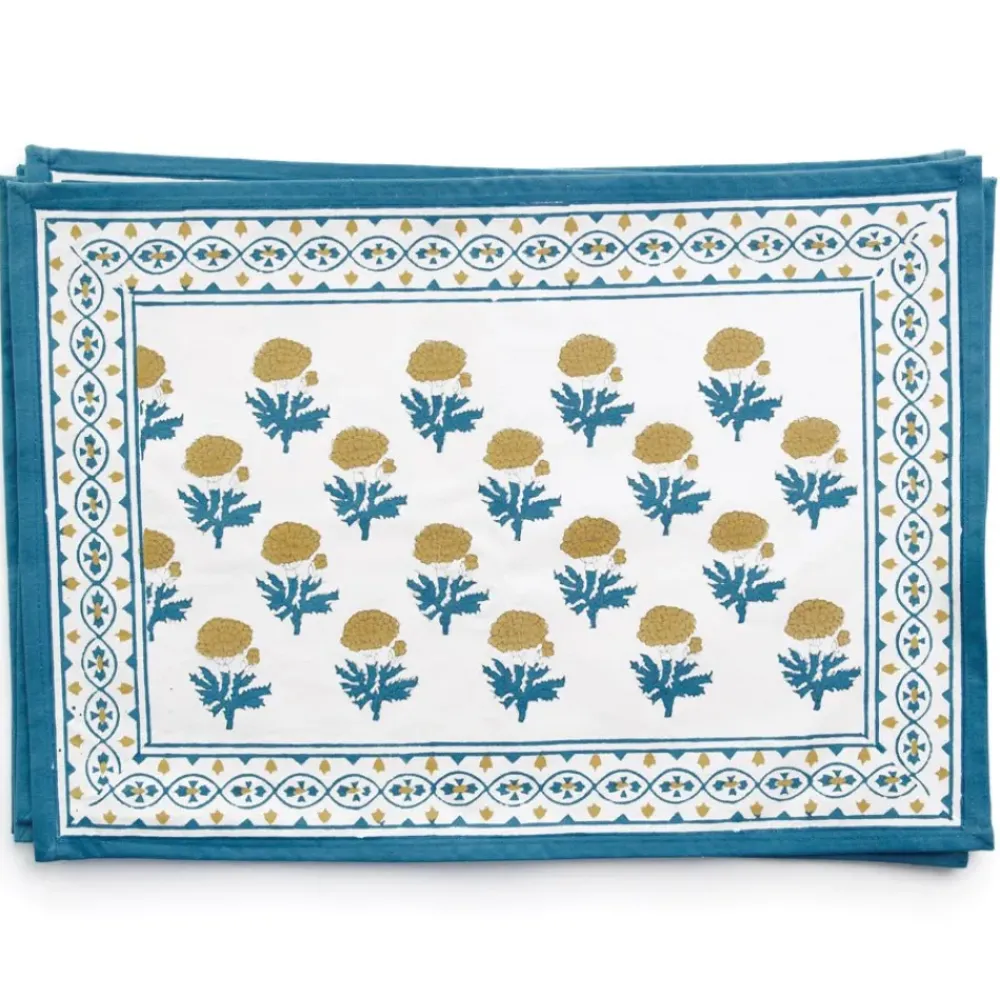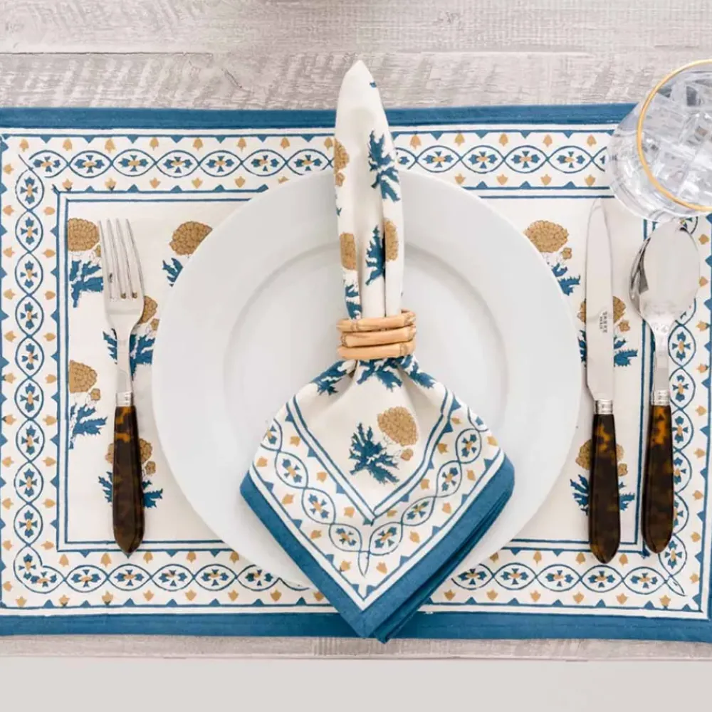 Named after an ancient and holy city in India, our Gaya Teal & Marigold placemat capture the splendor, mystery and beauty of the Asian subcontinent. Printed by hand using rich dyes and carved wooden blocks to achieve a one-of a-kind design, these cotton dinner napkins make a striking display on your formal tabletop.