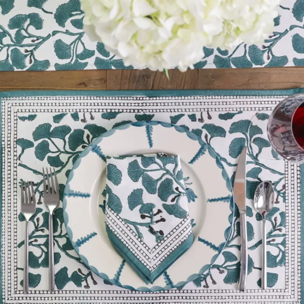 Set the stage for a memorable meal with our Ginkgo Teal Placemats. Featuring a hand block printed design of intricate teal ginkgo leaves, these placemats bring a vibrant yet refined look to your table. The bold color and artistic detailing make them a standout choice for any occasion, from family dinners to festive celebrations.