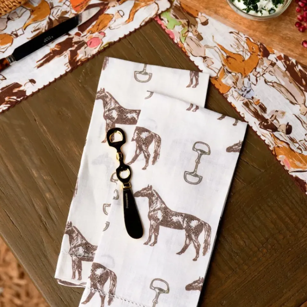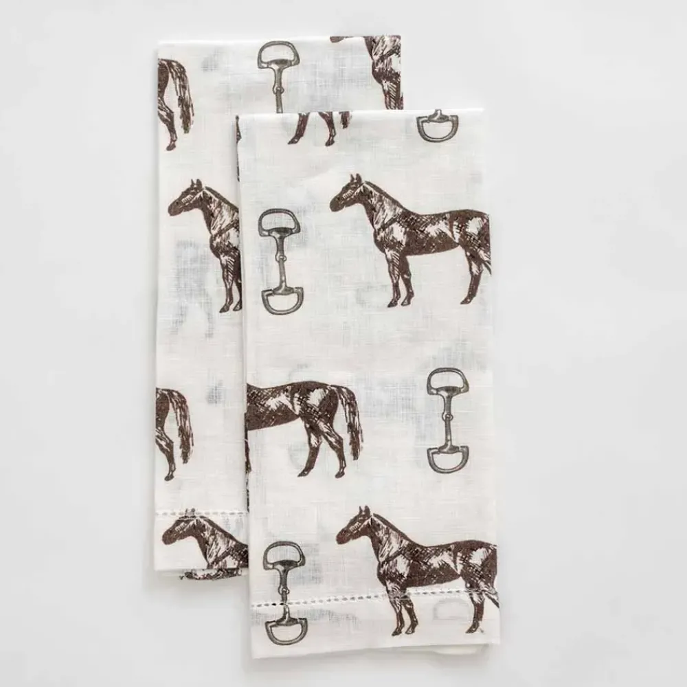 Our luxuriously soft 100% Linen Horse and Snaffle hand towels have a wonderful heirloom feel, and timeless equestrian style. This elegant, handsome and classic hand sketch design with rich umber horses and silver gray horse bits is a lovely addition to the horse enthusiasts collection.