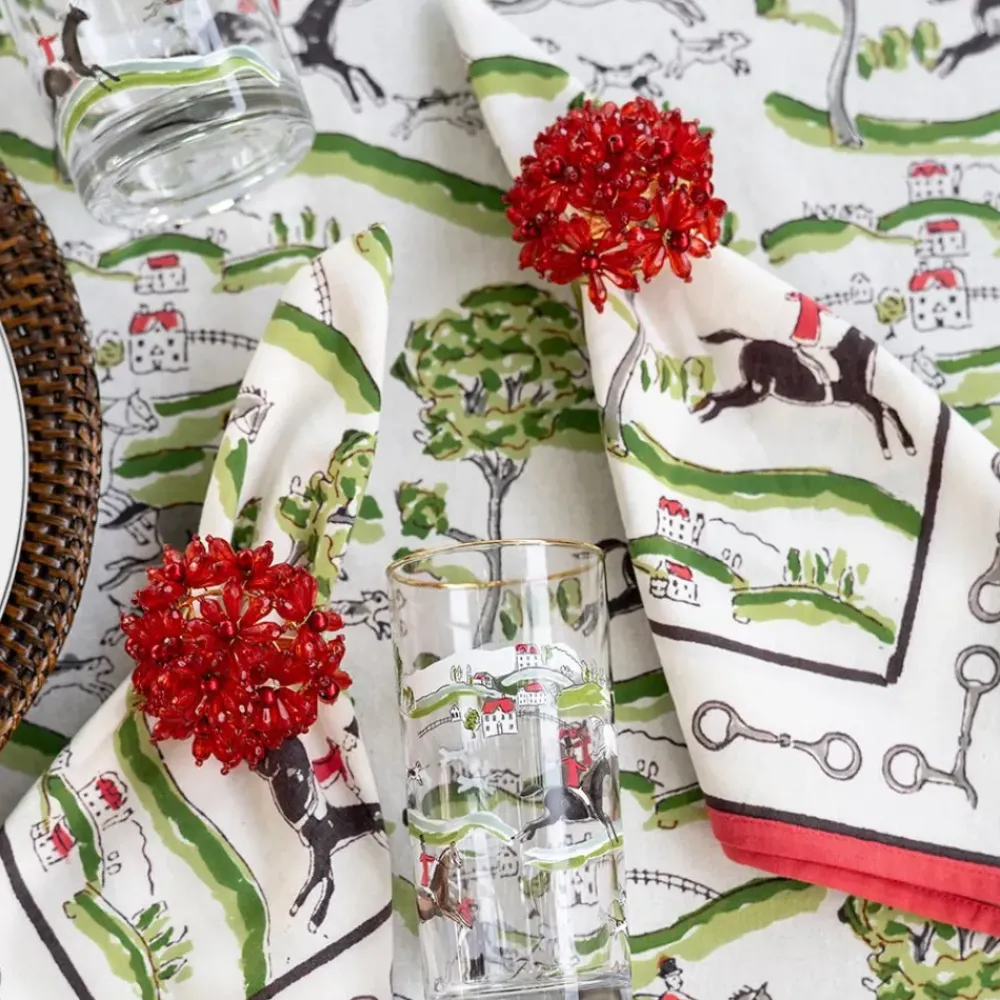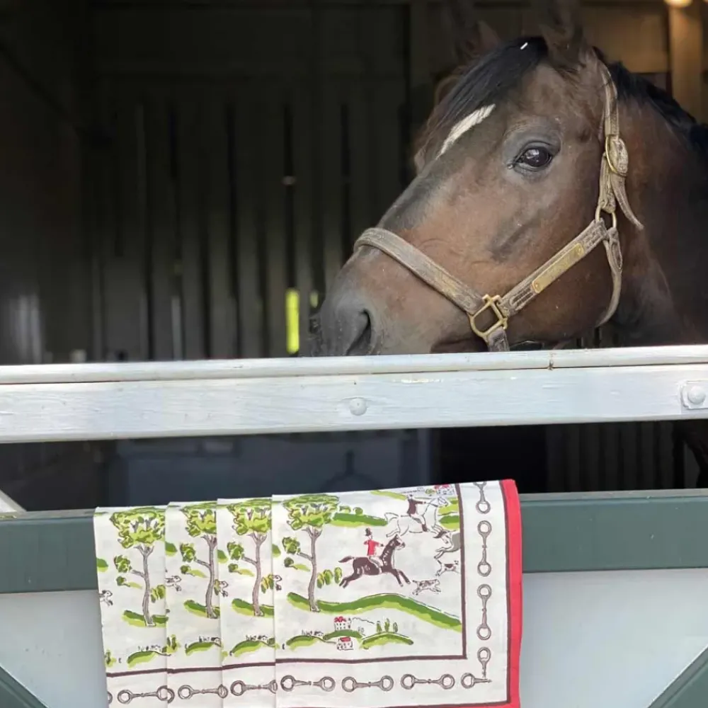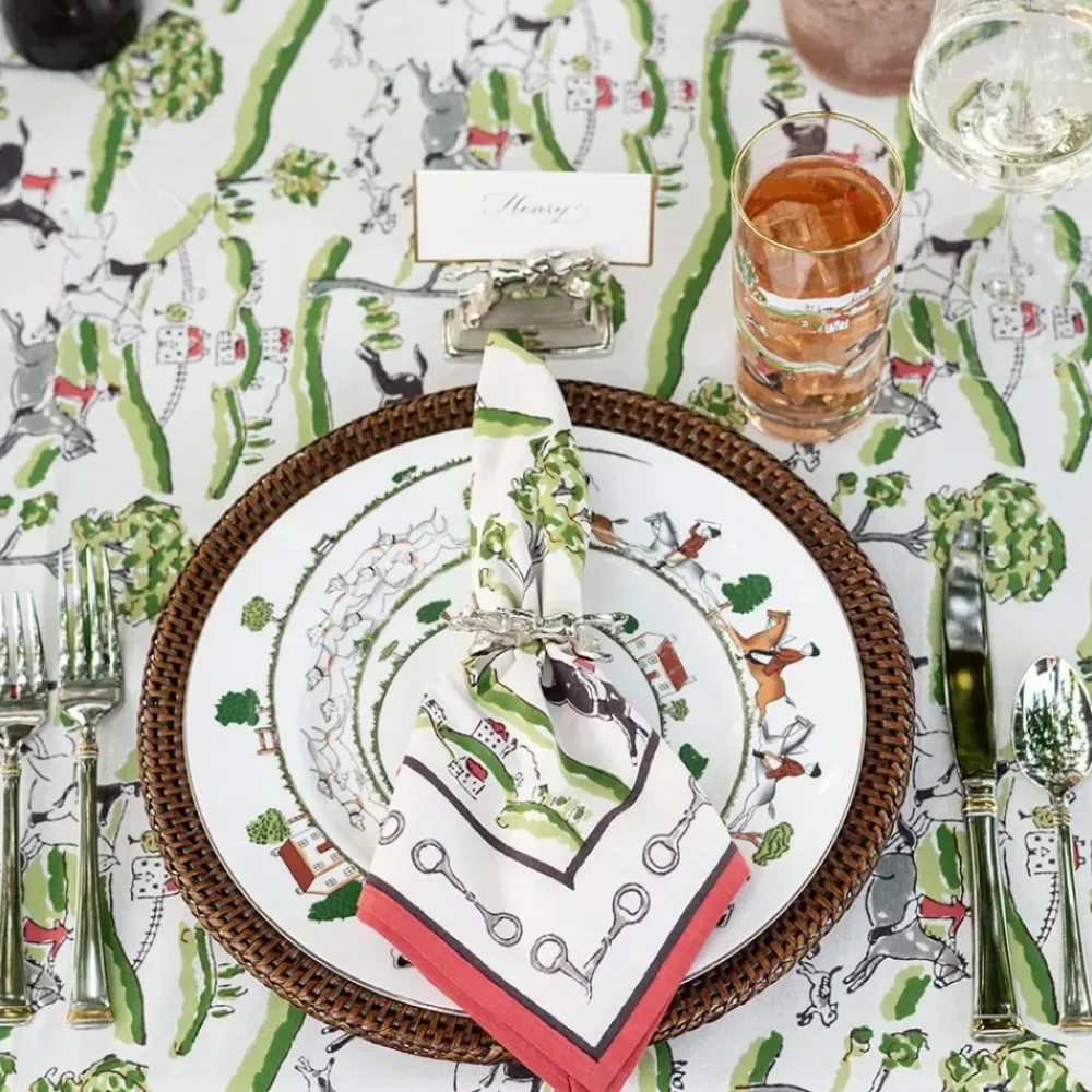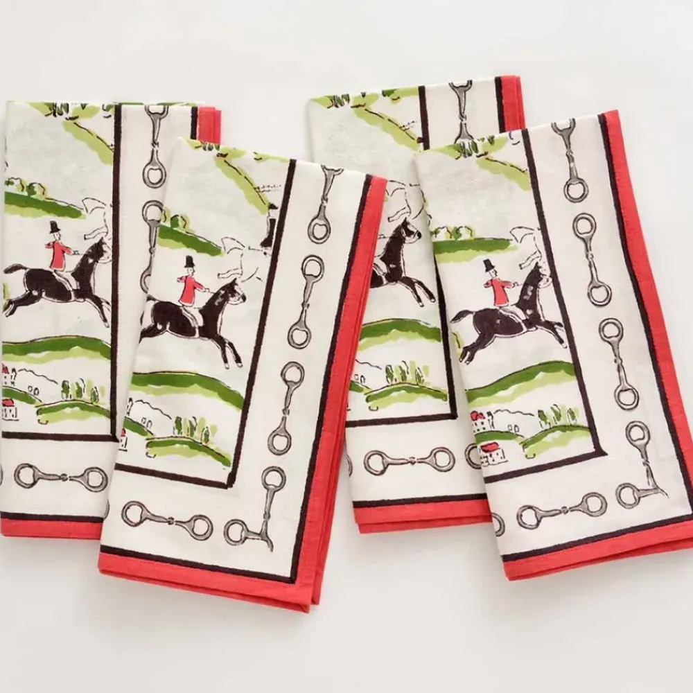Our exclusive hunt scene napkin adorned with a traditional historic scene that was inspired by historic equestrian prints. Regal gentlemen poised on the back of their majestic hunting horses, chasing the fox through the countryside dotted with red tiled cottages and their loyal pointer dogs leading the way. Lovely equestrian napkins to elevate your table. Sold in sets of 4.
