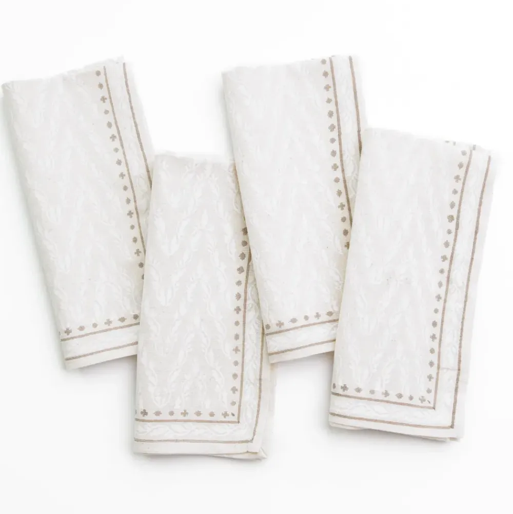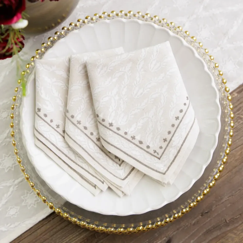 In the olden days, what we now see as the gold shoulder braid on high-ranking officers—called an aiguillette (pronounced “egg-wee-let”)—was originally just rope and pegs. It was carried on the shoulder by a knight’s aide-de-camp, ready to tether the knight’s horse. The ornamental braided cords with decorative metal tips are now worn on uniforms by officers to distinguish special and senior appointments, but wouldn’t it be fun if they were still used to tether the occasional horse? This hand block printed Chevron patterned napkin set draws its inspiration from those striking gold braids. It’s a modern take on tradition, perfect for bringing a bit of timeless style to any setting.