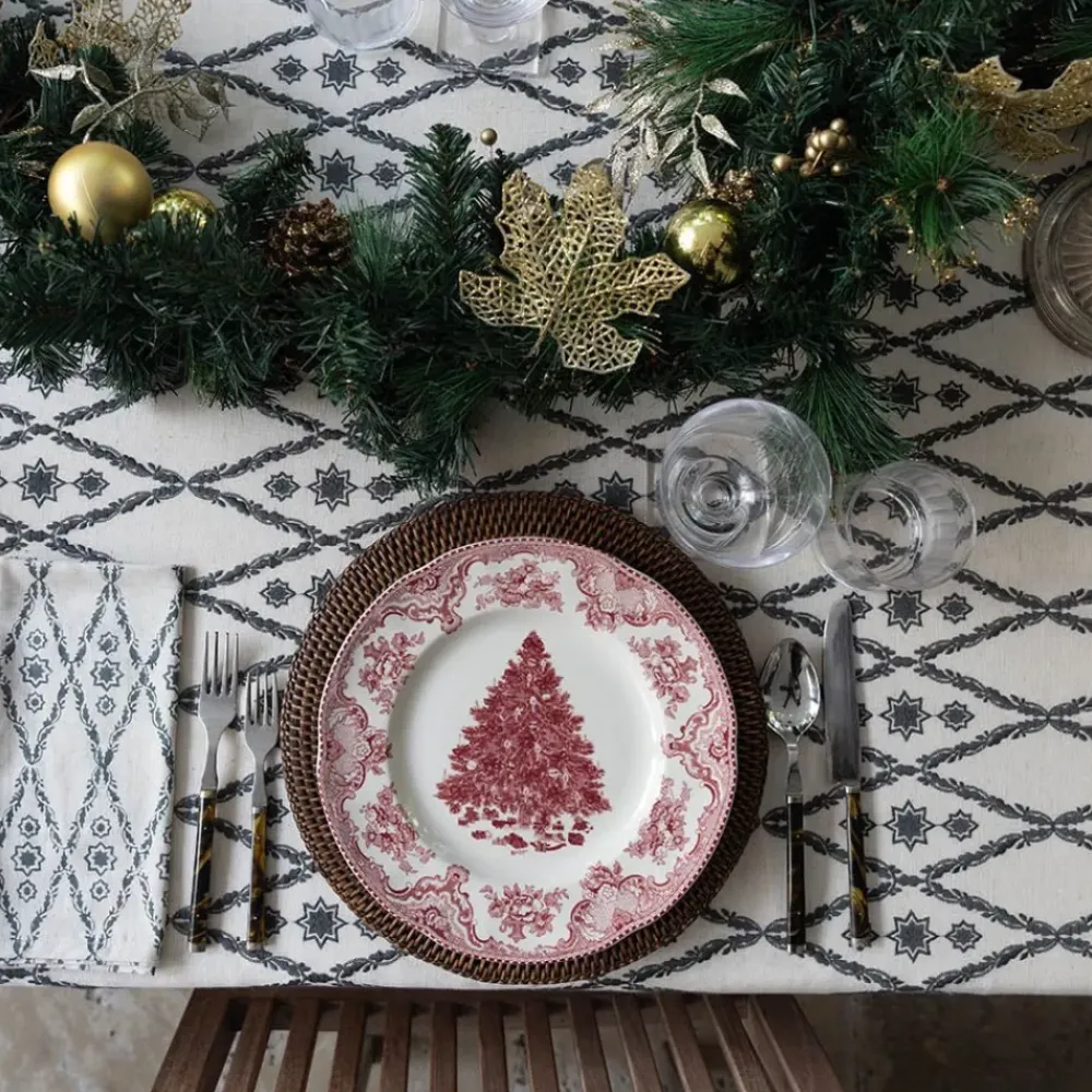 The ceremonial gold-laced belt worn by an Admiral of the Fleet—the highest rank in the Royal Navy—was designed to support a sword. Of course, raising a ceremonial sword today is purely symbolic; no duels are about to take place. India’s son, Felix, who designed this tablecloth, took inspiration from the intricate pattern of his great-grandfather’s belt and transformed it into an interlaced diamond design. Embroidered on a luxurious cotton-linen blend, this tablecloth beautifully weaves a story of legacy and history into every thread—a timeless addition to your table setting.