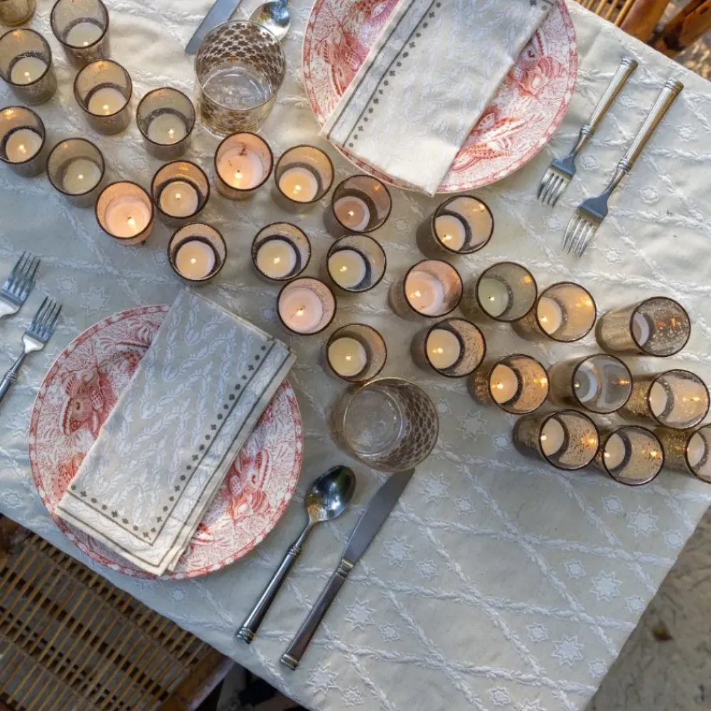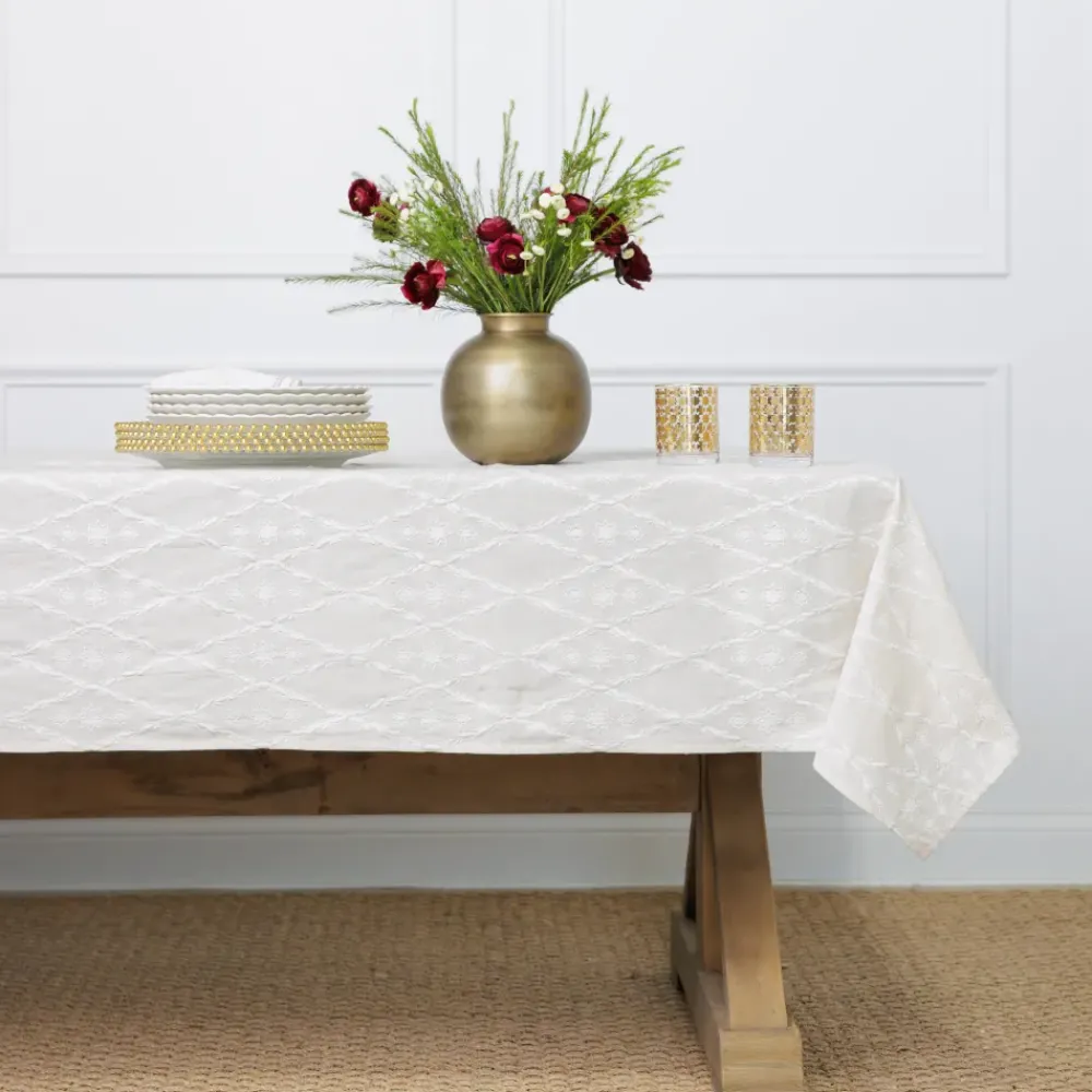 Embroidered on a luxurious off-white cotton-linen blend, this tablecloth beautifully weaves a story of legacy and history into every thread—a timeless addition to your table setting.