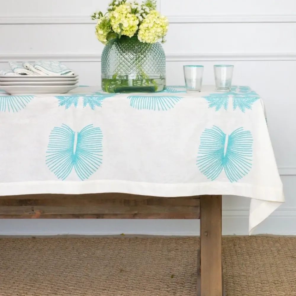 The India Hicks Home Embroidered Twin Palms tablecloths are hand embroidered in India by skilled artisans. The beautiful cotton blend fabric has a slight stretch and resilience to it, creating a keepsake that can be brought out for your favorite dinner guests for years to come.