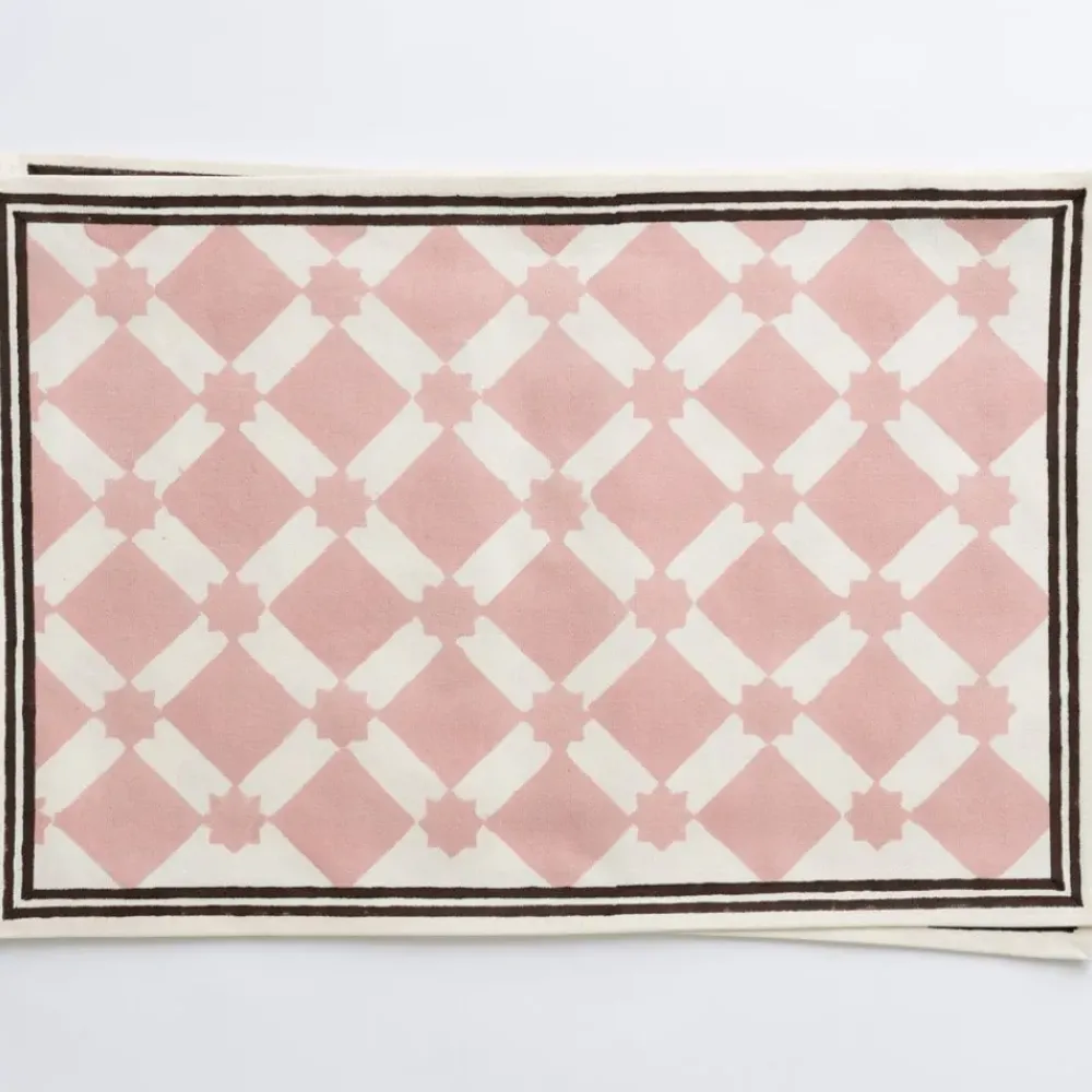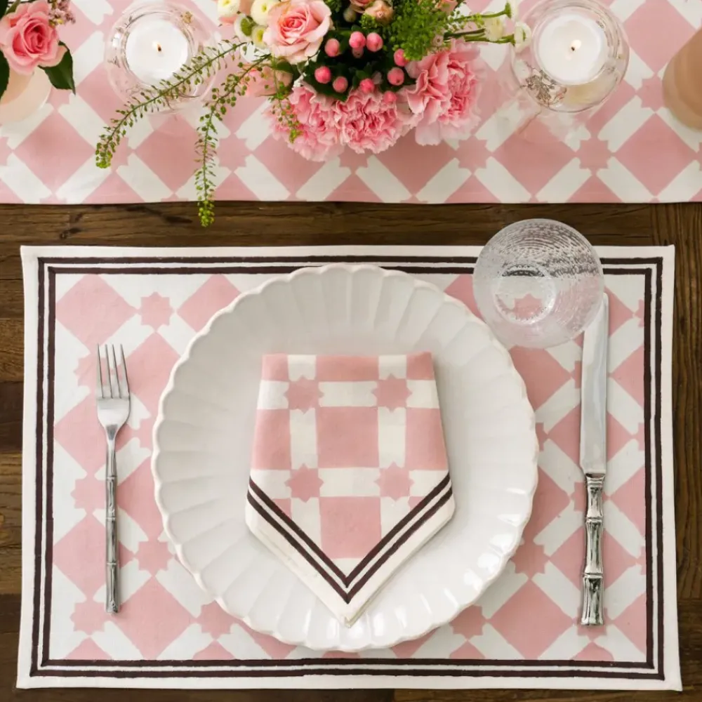 Our Latticework Blush Placemats were designed to encapsulate the whimsical essence of wandering through narrow streets adorned with picket fences, quaint wooden homes painted in soft, pretty hues, and a mesmerizing labyrinth of latticework.