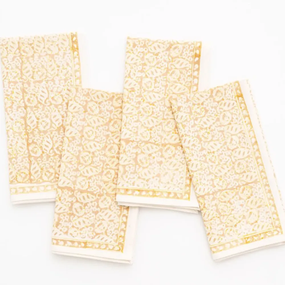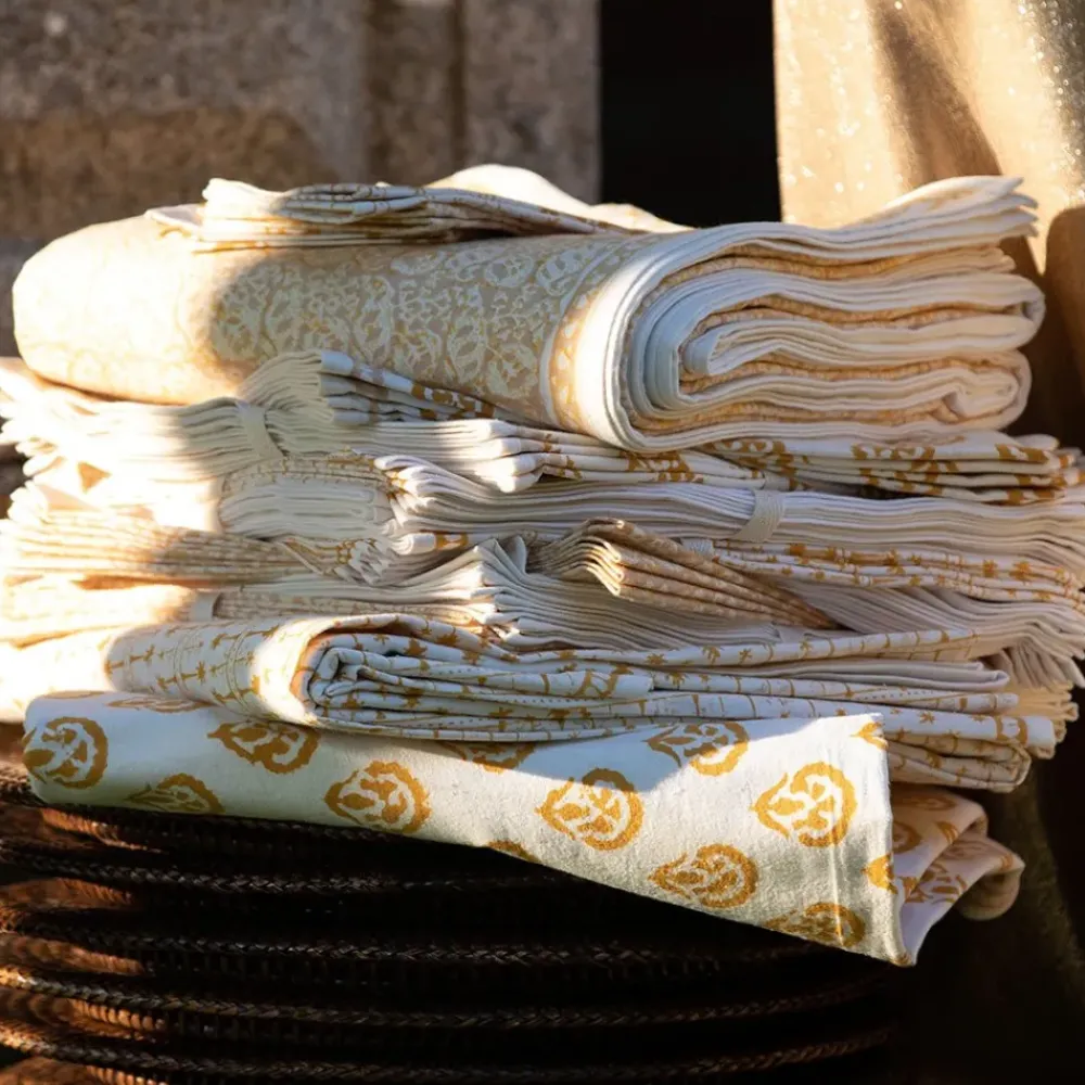 This beautiful set of 100% cotton hand blocked printed napkins in Seashell Golden is intended to be mixed haphazardly together with the other patterns, just as our families are.