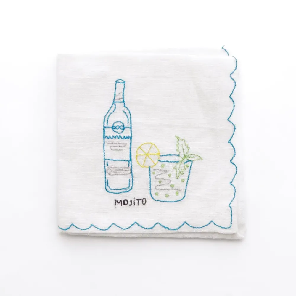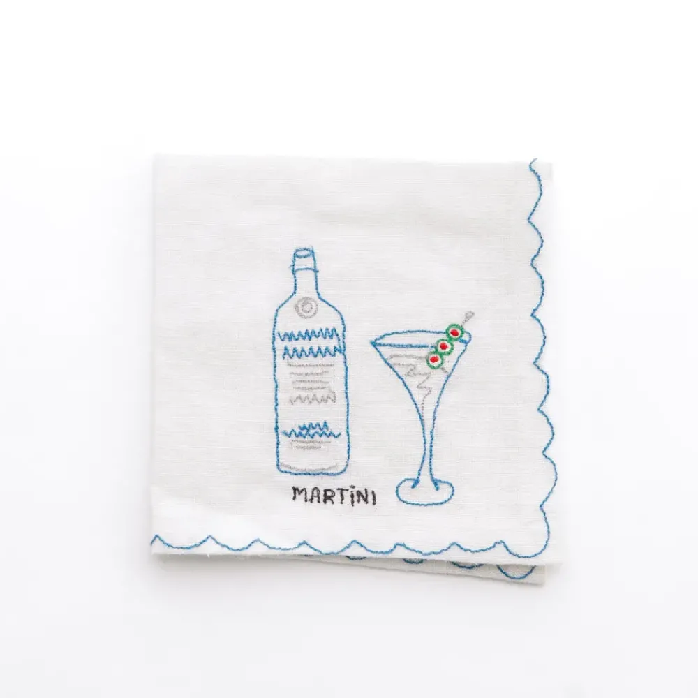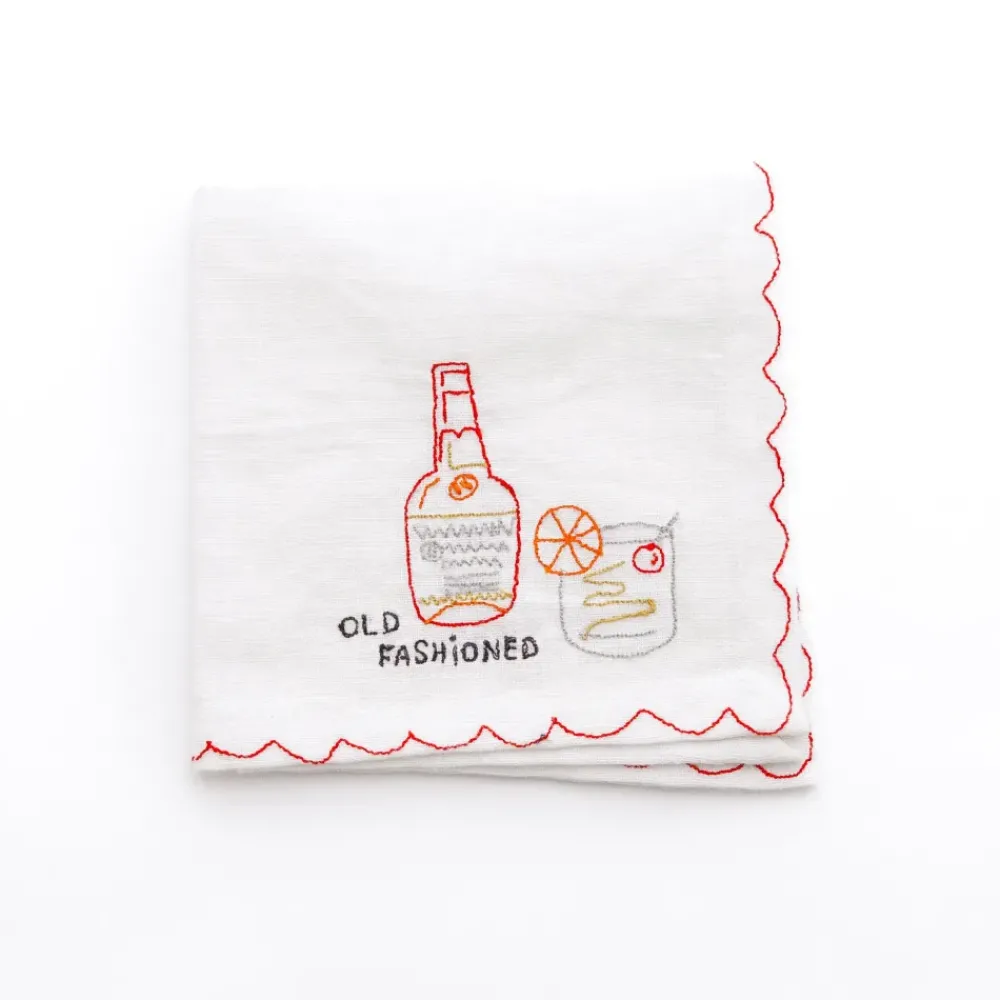 This set of six linen cocktail napkins features vibrant, hand-embroidered designs of classic cocktails: Old Fashioned, Gin & Tonic, Aperol Spritz, Margarita, Martini, and Mojito. Each napkin is accented with a colorful scalloped edge that coordinates with the drink’s embroidery, creating a playful yet elegant aesthetic. Perfect for hosting or gifting, these napkins bring a fun, whimsical vibe to any gathering while remaining practical for everyday use.