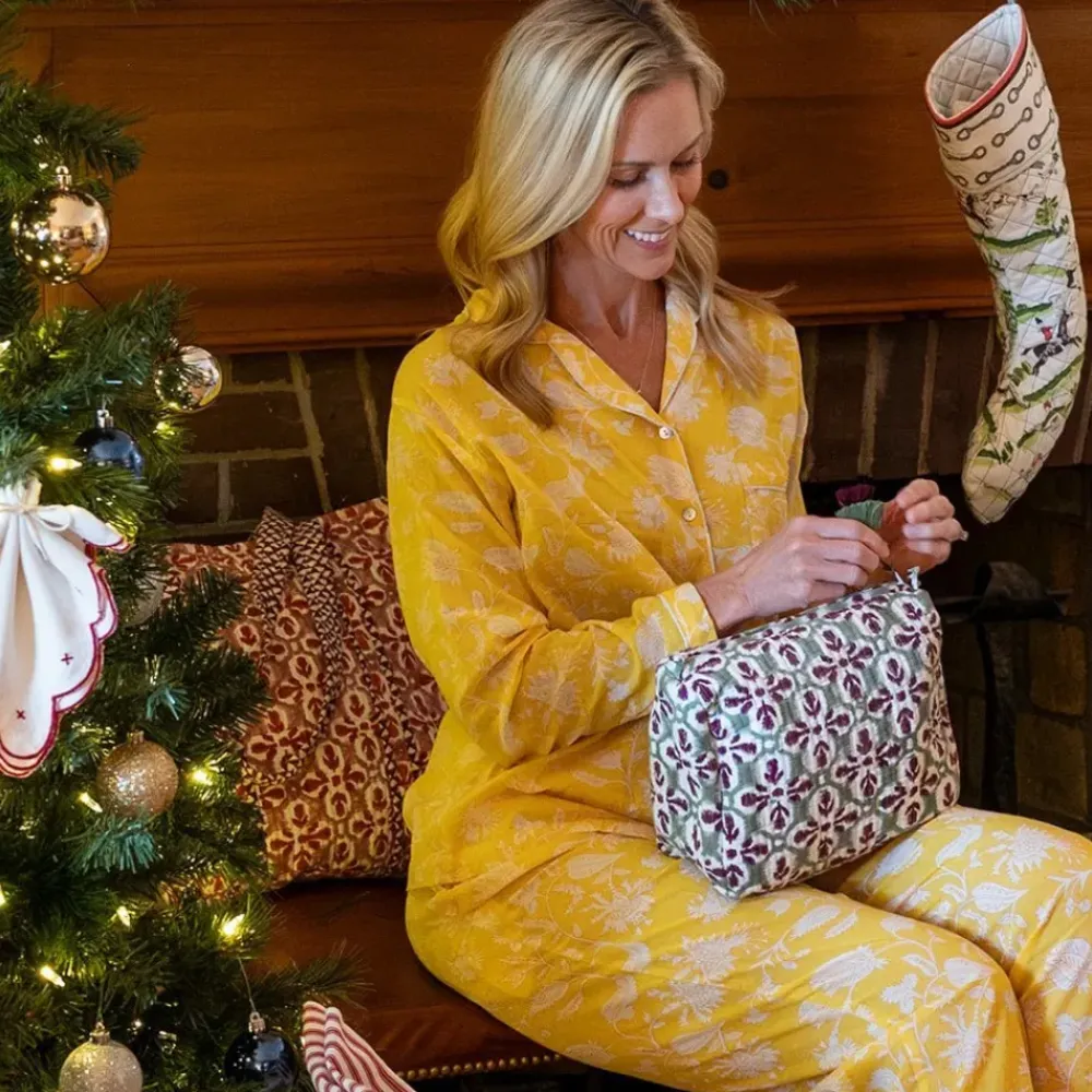 Enjoy effortless comfort with this yellow pajama set, featuring a subtle botanical print. Made from soft, breathable 100% cotton, it’s perfect for unwinding at home or getting a good night’s sleep–but is bright and cheerful enough for a pulled together look on Christmas morning. The top has a button-down front with a classic notched collar and piping details, while the relaxed-fit pants include an elastic waistband and side pockets. Practical and stylish, this set is designed for those who appreciate simple, comfortable loungewear.