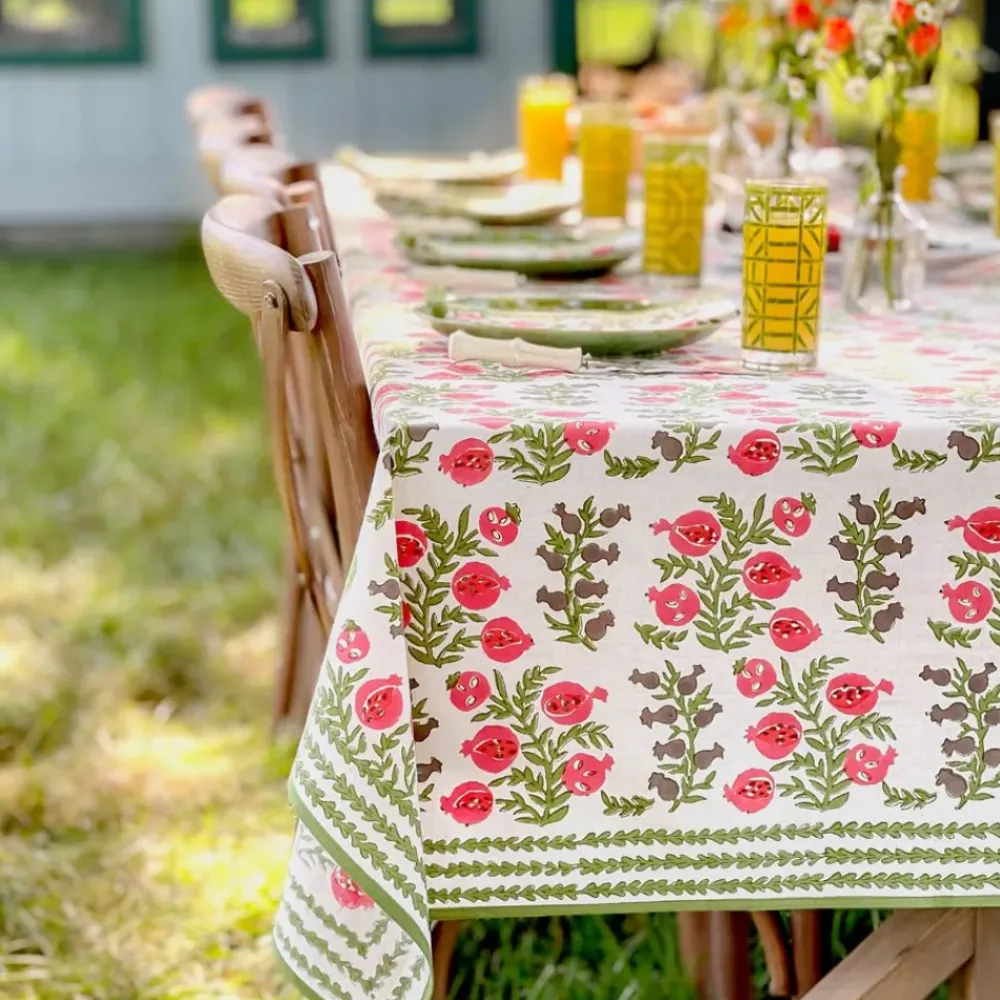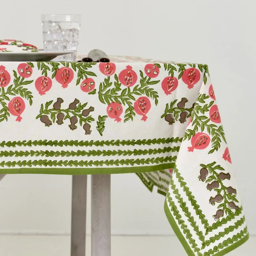 The sweet shape of young pomegranates inspired this print, which features the fruit in both its baby and mature stages. Lively tree branches with vibrant green leaves end with plump pomegranates in coral and salmon hues. This tablecloth pairs beautifully with the Pomegranate Green napkins and Natural Bamboo Cane Placemats.
