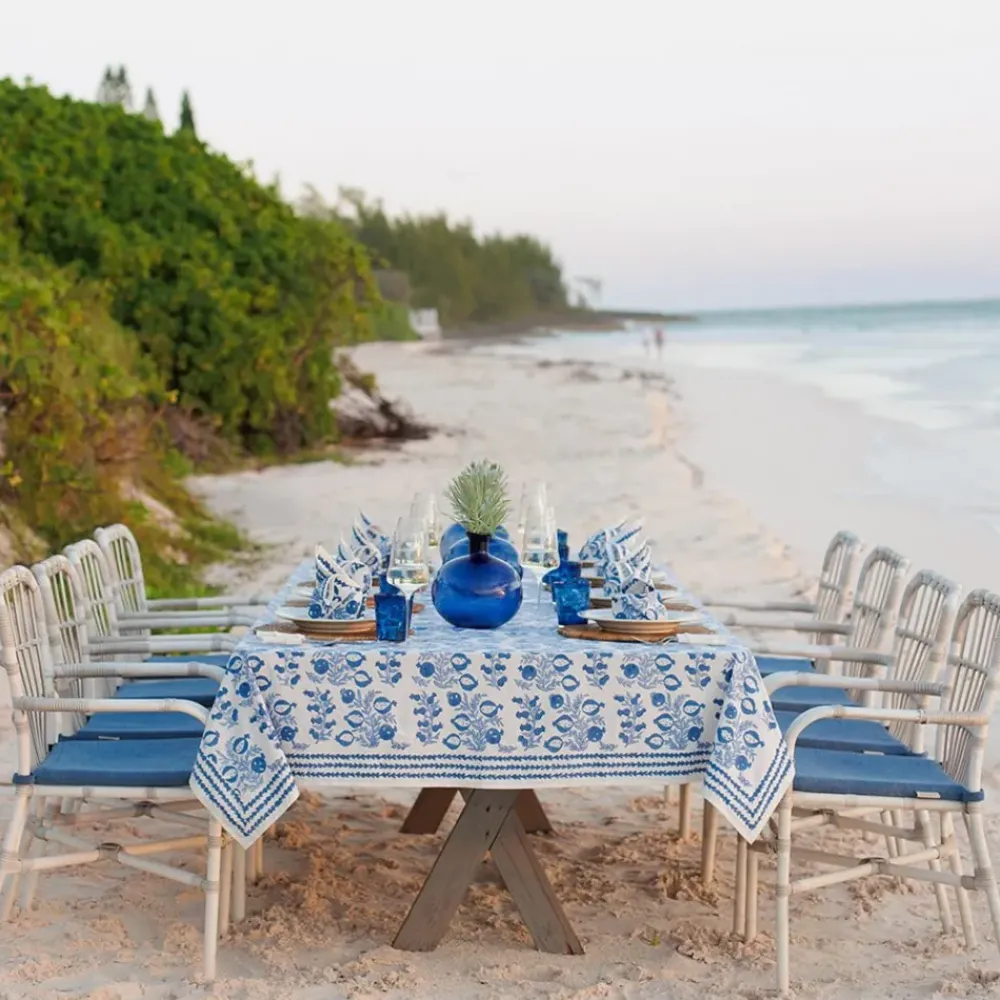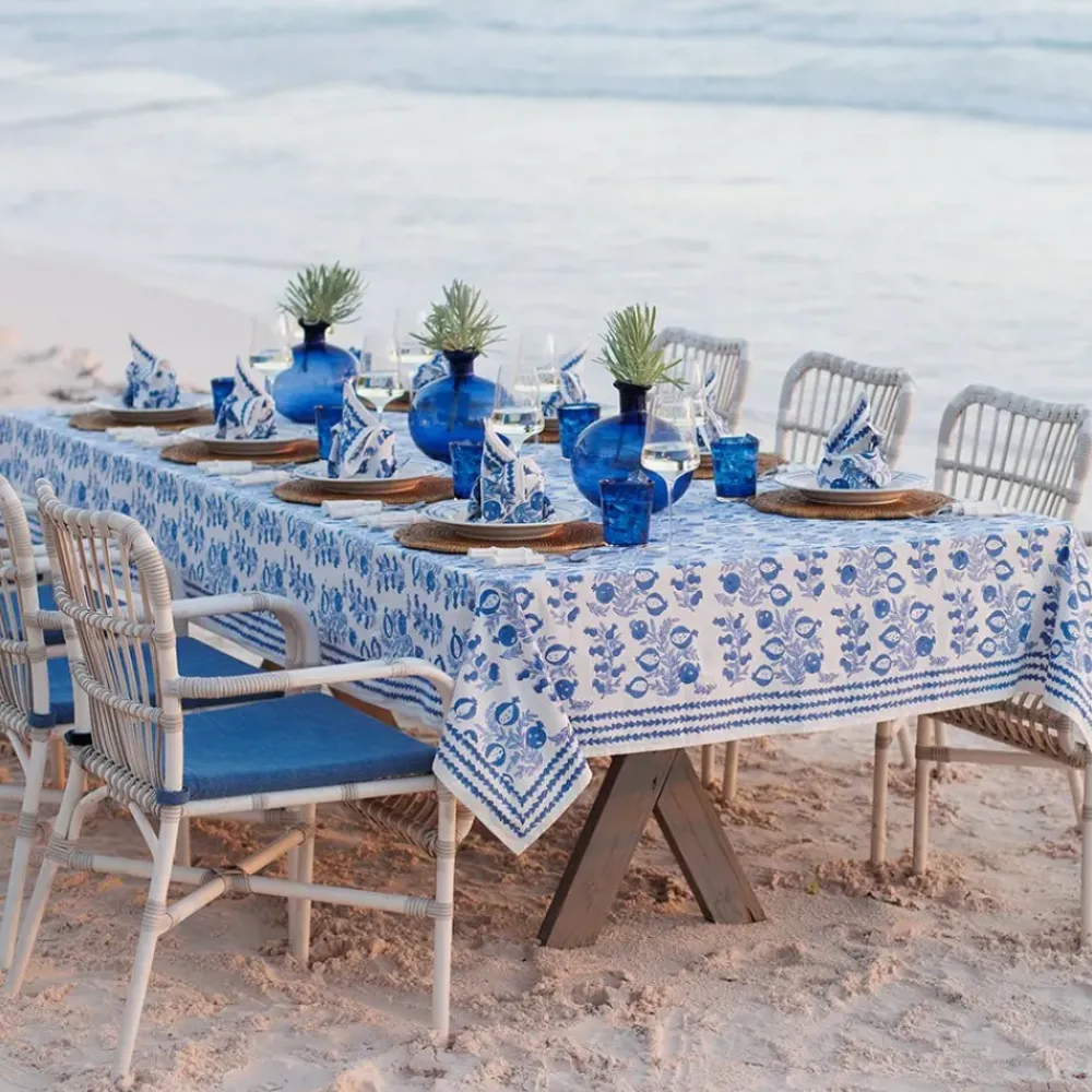 The sweet shape of young pomegranates inspired this print, which features the fruit in both its baby and mature stages. Lively branches with pale blue leaves end with plump pomegranates in varying shades of blue. This tablecloth pairs beautifully with the Pom Bells Wedgewood napkins and runner. Add our Natural Bamboo Cane Placemats for additional style.