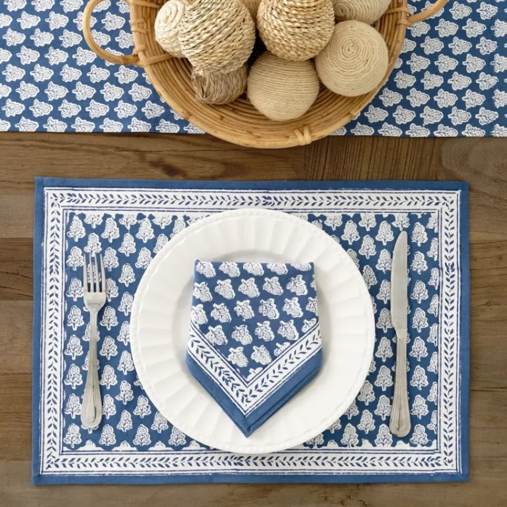 Our Pom Buti Denim Placemats are more than just a practical choice; they’re a canvas for your creativity and a way to express your personal style. These placemats feature a serene blue background adorned with a delicate white floral design, creating a captivating and timeless look that enhances any dining experience.