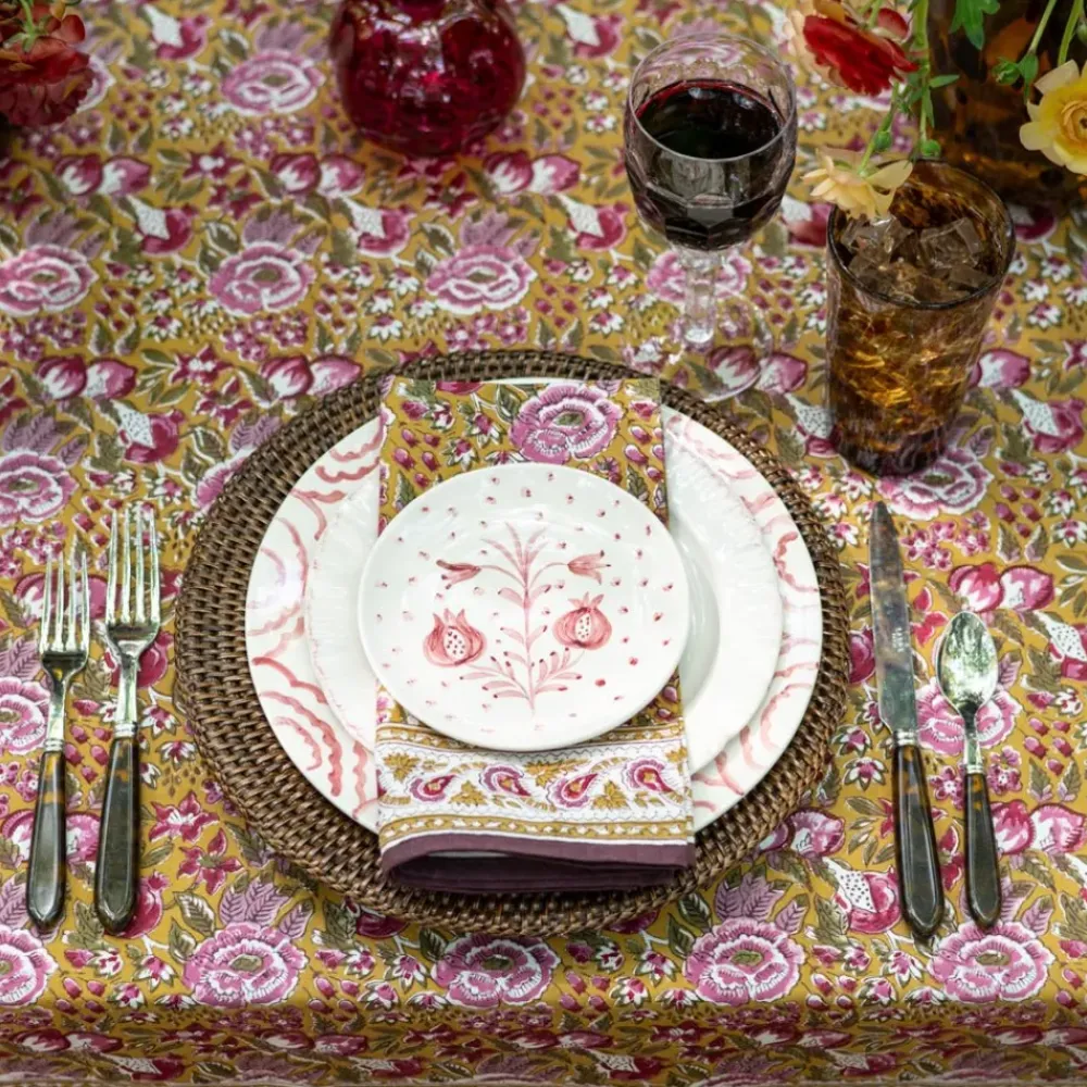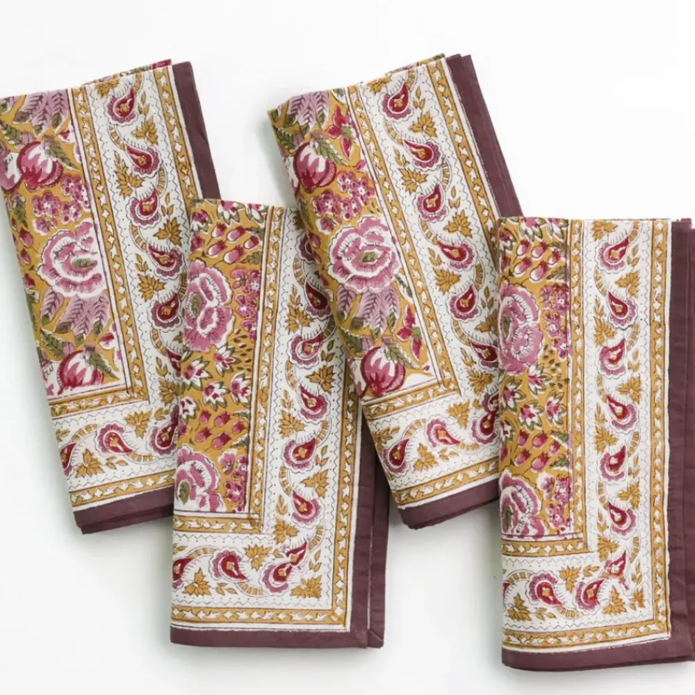 Immerse your table in rich, botanical elegance with our Pomegranate Garden Plum & Ochre Napkins. This set of four napkins features a captivating floral design with deep plum and warm ochre tones. Framed by a paisley border, the hand block printed details bring an artisanal touch to your dining setting. Crafted from 100% cotton, these napkins are soft, durable, and machine washable—perfect for everyday meals or special gatherings.