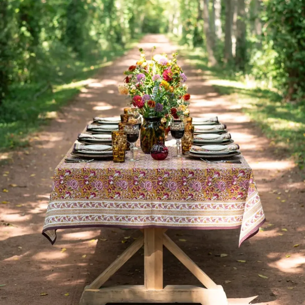 Transform your dining table with our Pomegranate Garden Plum & Ochre Tablecloth. This tablecloth features a vibrant floral pattern in rich plum, pink, and ochre hues. Hand block printed on 100% cotton, it adds elegance and warmth to any meal, whether you’re hosting a special occasion or enjoying everyday dining. Let this tablecloth be the centerpiece of your next gathering, offering both beauty and durability.
