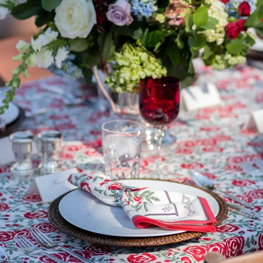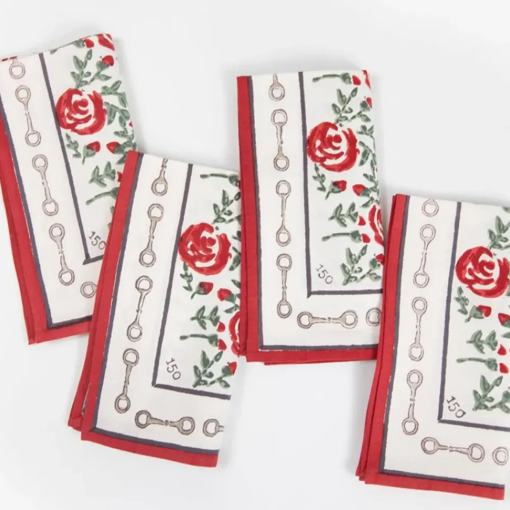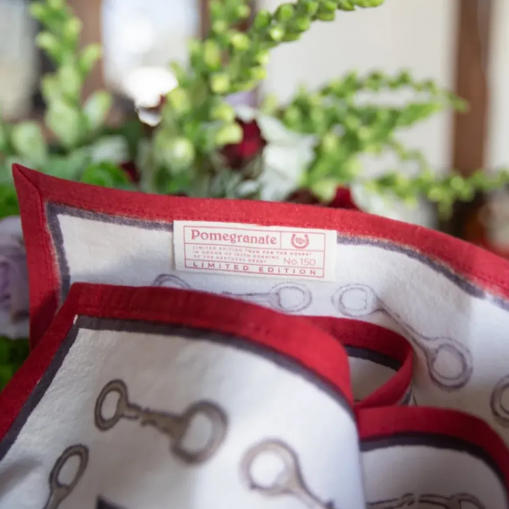 Elevate your table setting with our commemorative Run For The Roses Cloth Napkins. These limited edition napkins showcase a beautiful print of red hand blocked roses and verdant greenery, accented by a charming snaffle border. Each piece is hand stamped with “150” in honor of the 150th running of the iconic Kentucky Derby and features an exclusive sewn in label. Whether hosting a Derby-themed party or adding a touch of spring to your dining experience, these napkins are sure to delight.