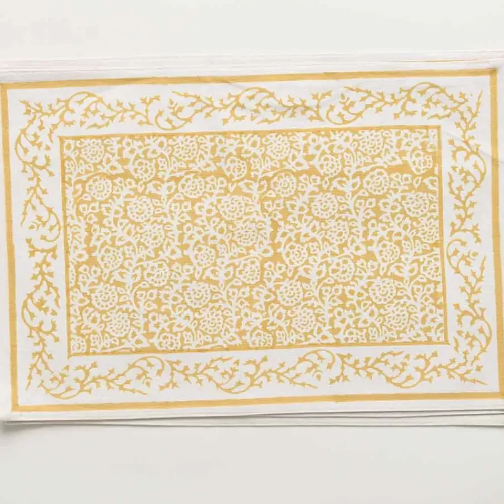 This updated traditional classic yellow and white hand block printed Tapestry Marigold placemat was designed to symbolize the weaving of stories that are shared during meals. Explore conversations with family, friends, and guests that remind us of the beauty of details and encapsulates the tapestry of your entertaining.