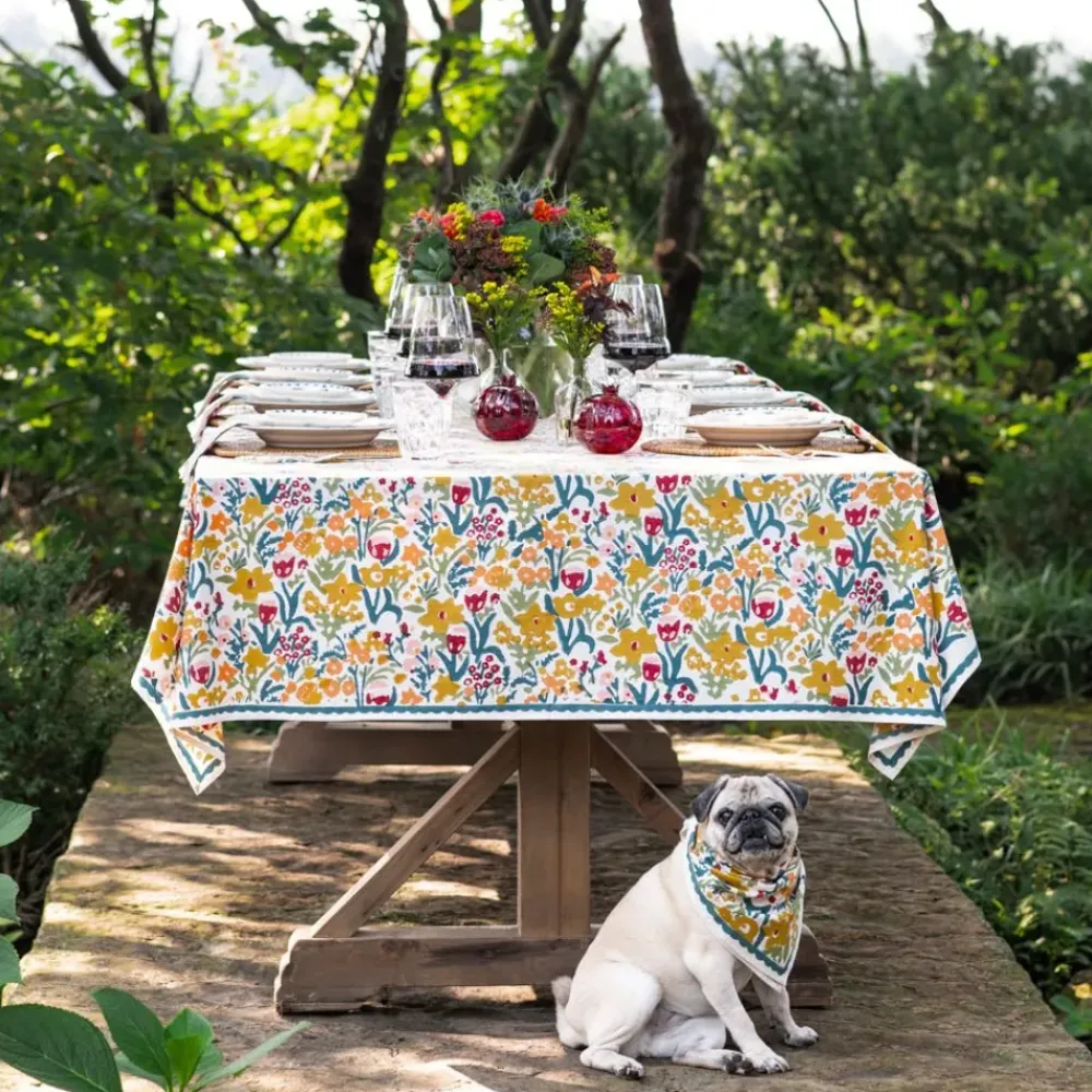 Invite the beauty of a blooming garden into your home with the Teal Garden Tablecloth. This hand block printed tablecloth features a colorful floral pattern in shades of teal, yellow, pink, and green. Whether for a family dinner or an outdoor picnic, this 100% cotton tablecloth creates an inviting, cheerful ambiance while being easy to care for. Its vibrant design and sturdy fabric make it a timeless addition to any dining experience.