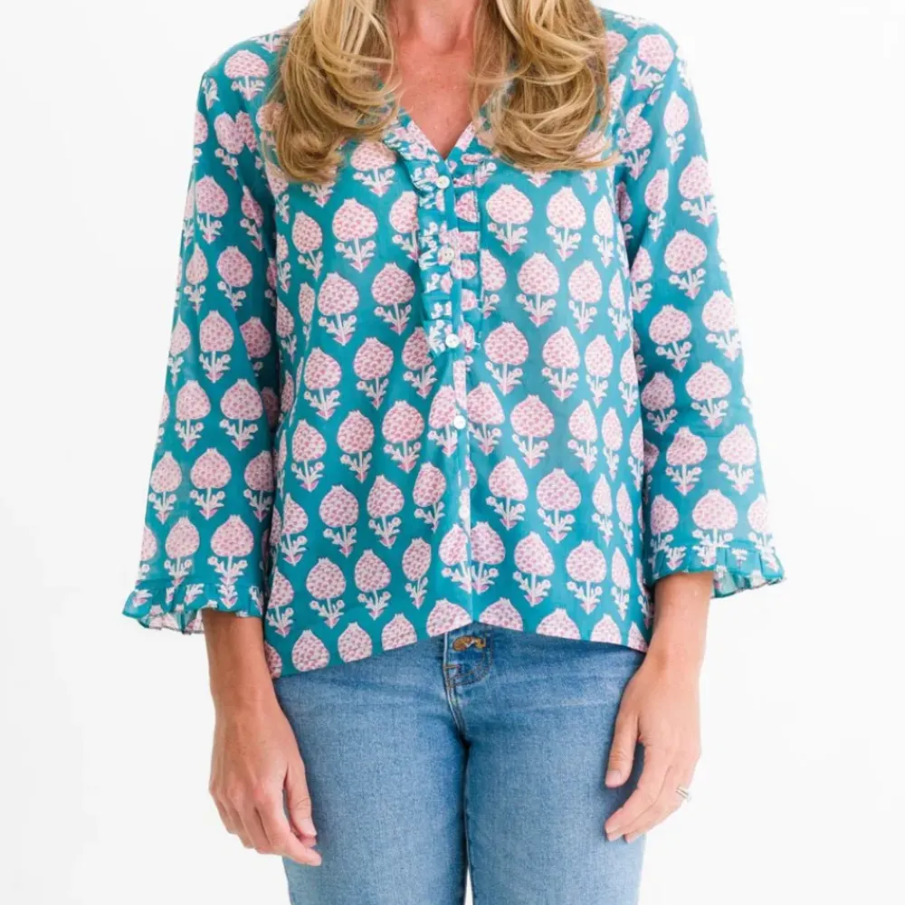 Introducing our Teal Pom Flower Flange Button Blouse, a must-have addition to any fashion-forward wardrobe. The vibrant turquoise and pink floral pattern exudes cheerfulness and elegance, while the signature three-quarter sleeves and ruffled flange add a touch of sophistication. Perfect for an effortlessly stylish look with jeans or shorts.